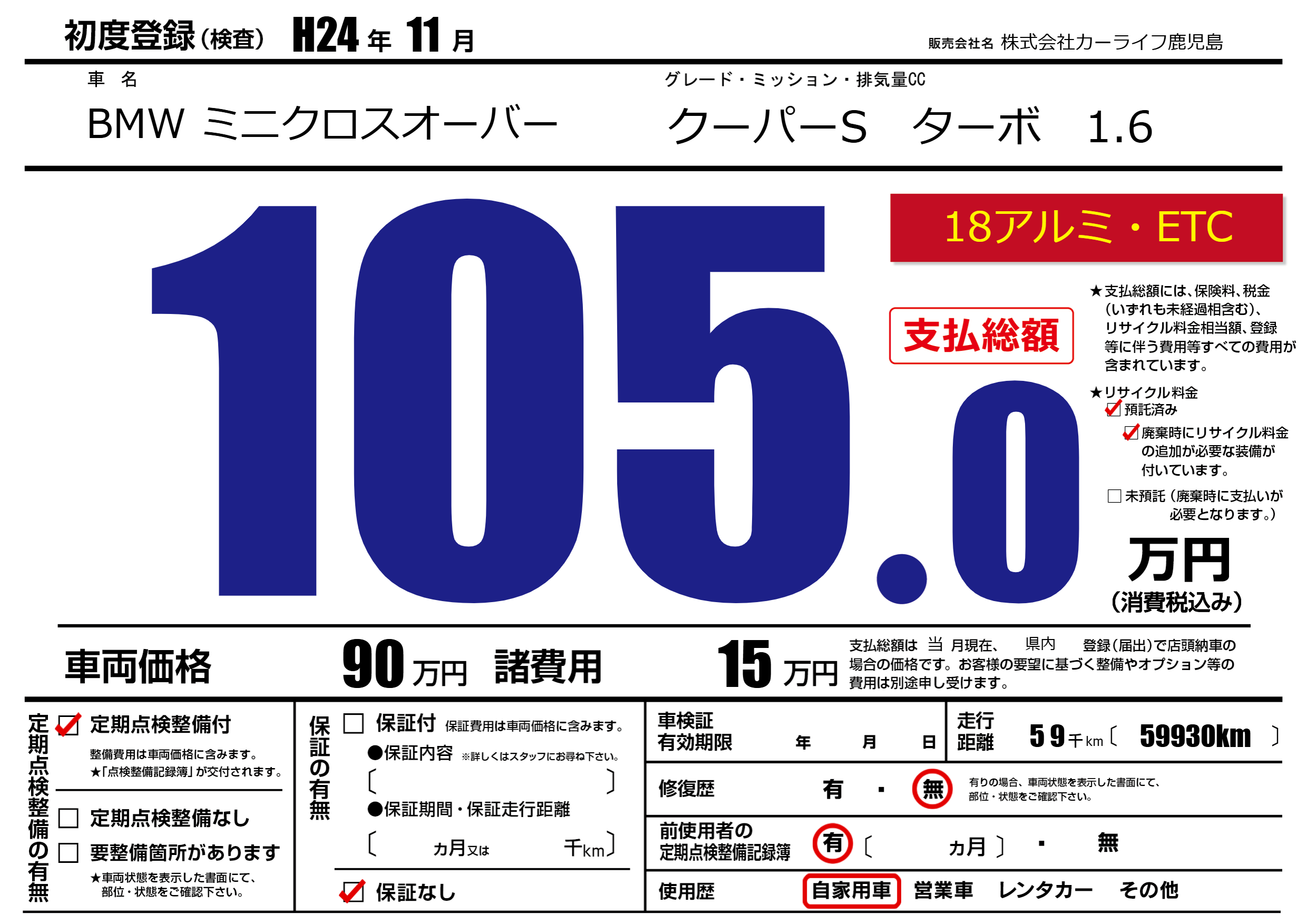 | 車名 | BMW ミニクロスオーバー | グレード ミッション 排気量 |