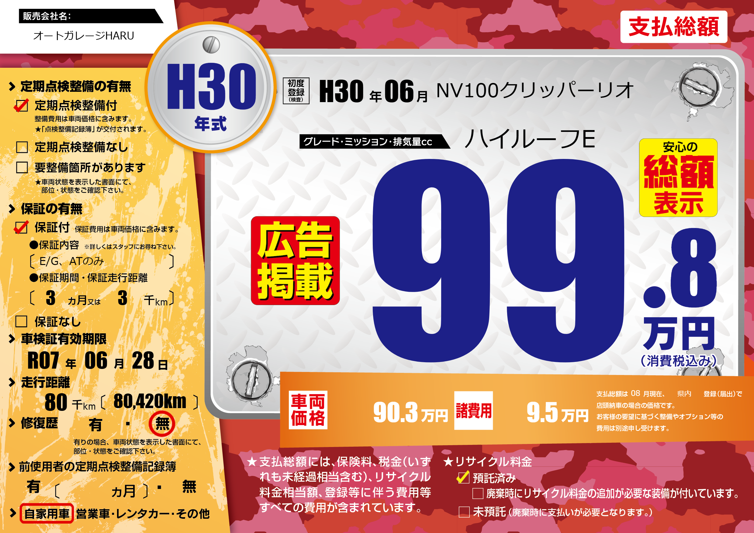 | 走行キロ | 8万km | 初年度登録 | H30年06月 |
