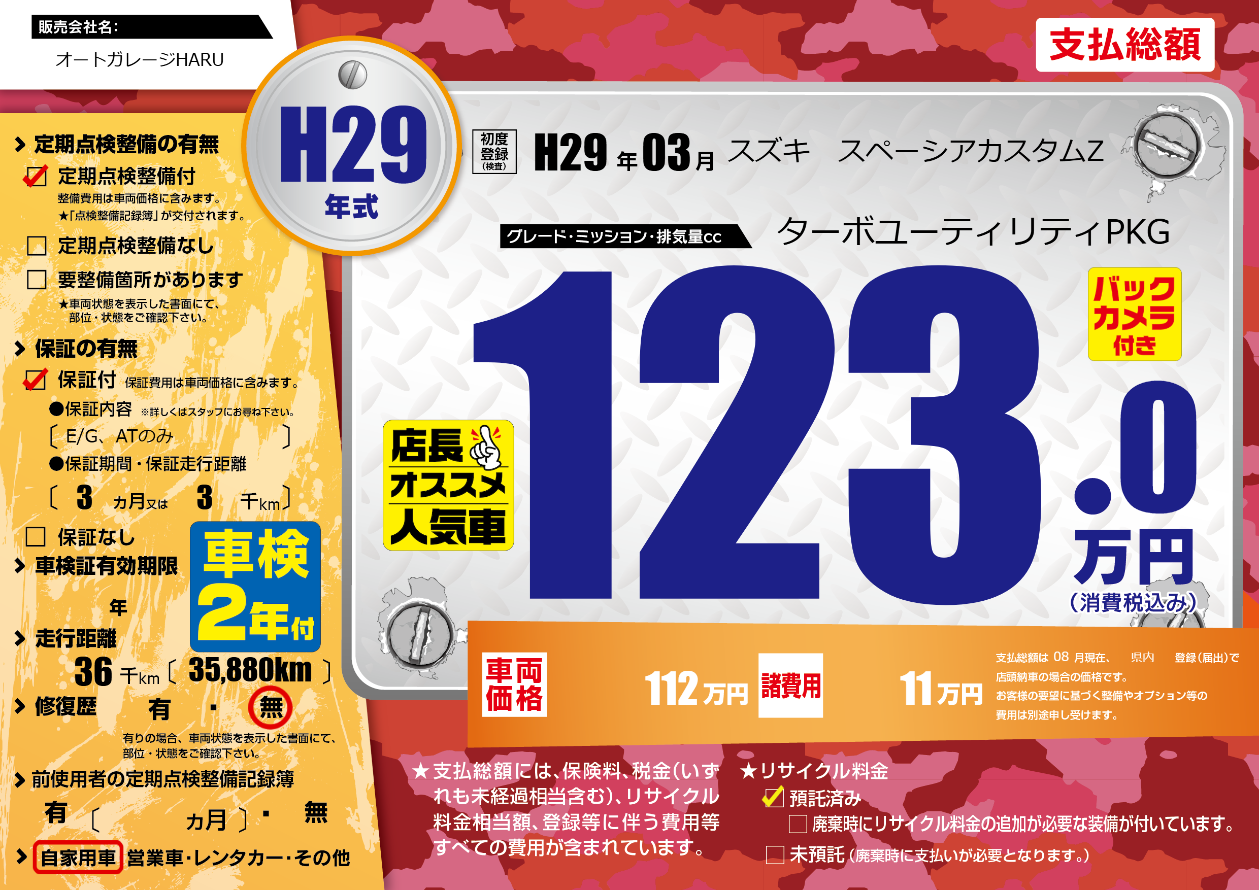 | 走行キロ | 3.6万km | 初年度登録 | H29年03月 |