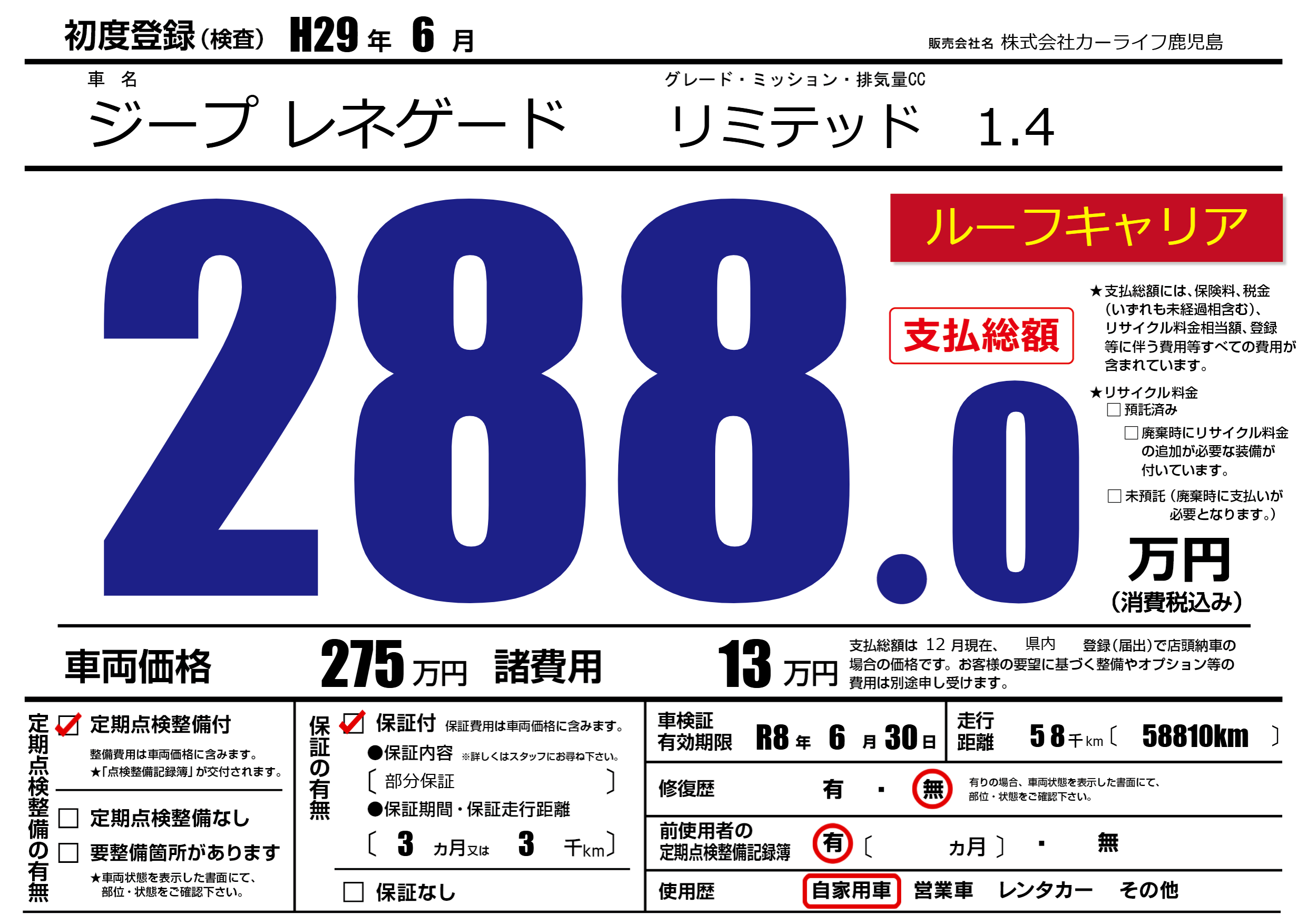 | 車名 | ジープ レネゲード | グレード ミッション 排気量 |