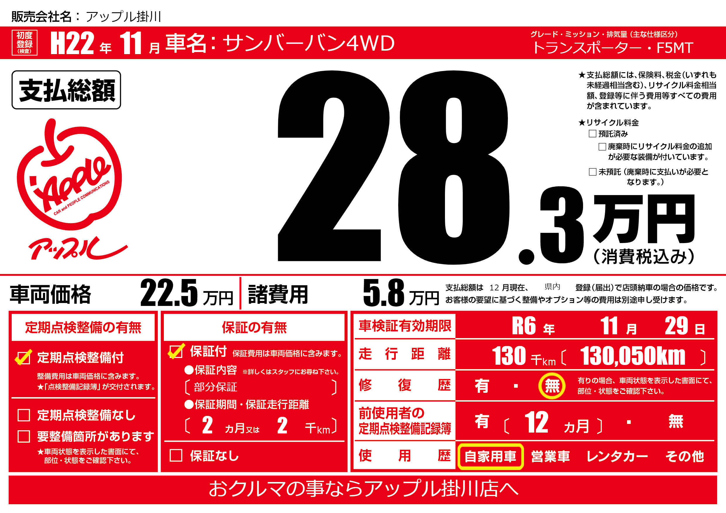 | 走行キロ | 13万km | 初年度登録 | H22年11月 |