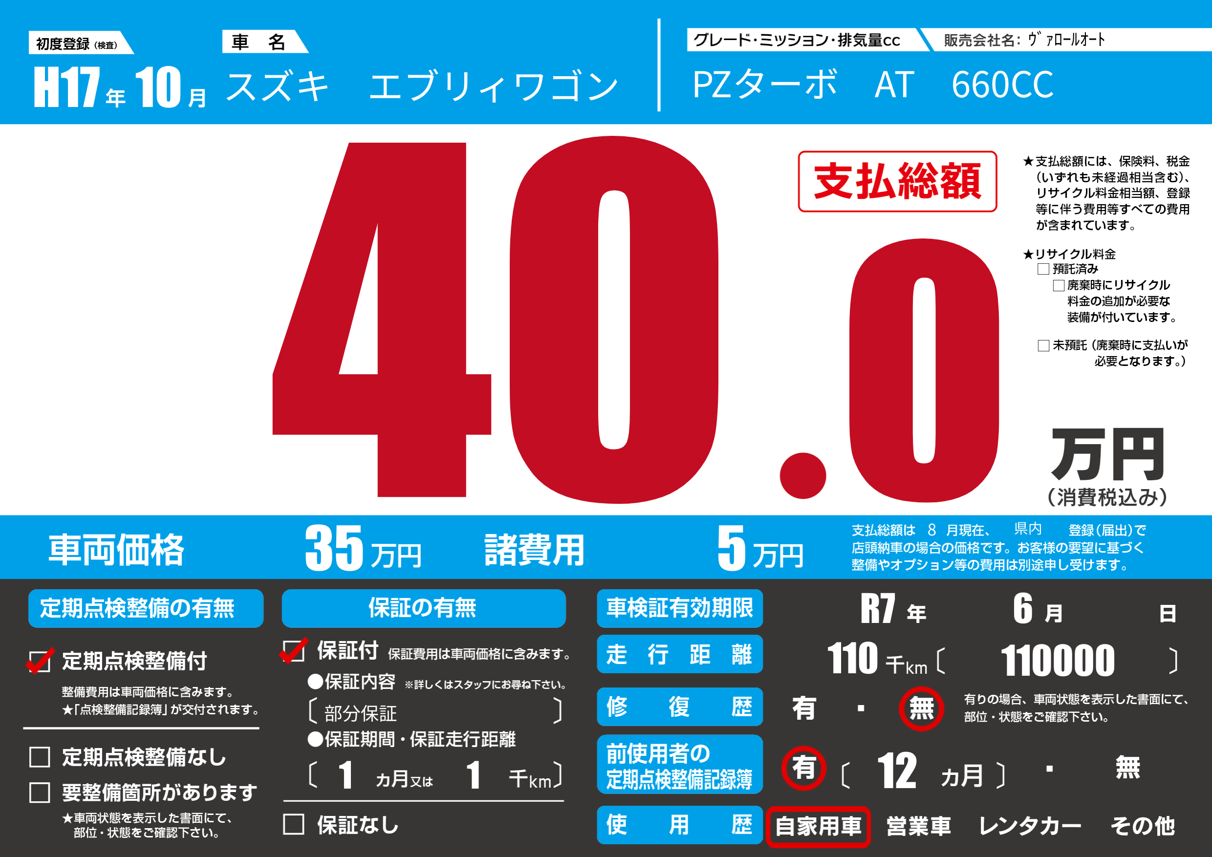 | 車名 | スズキ エブリィワゴン | グレード ミッション 排気量 |