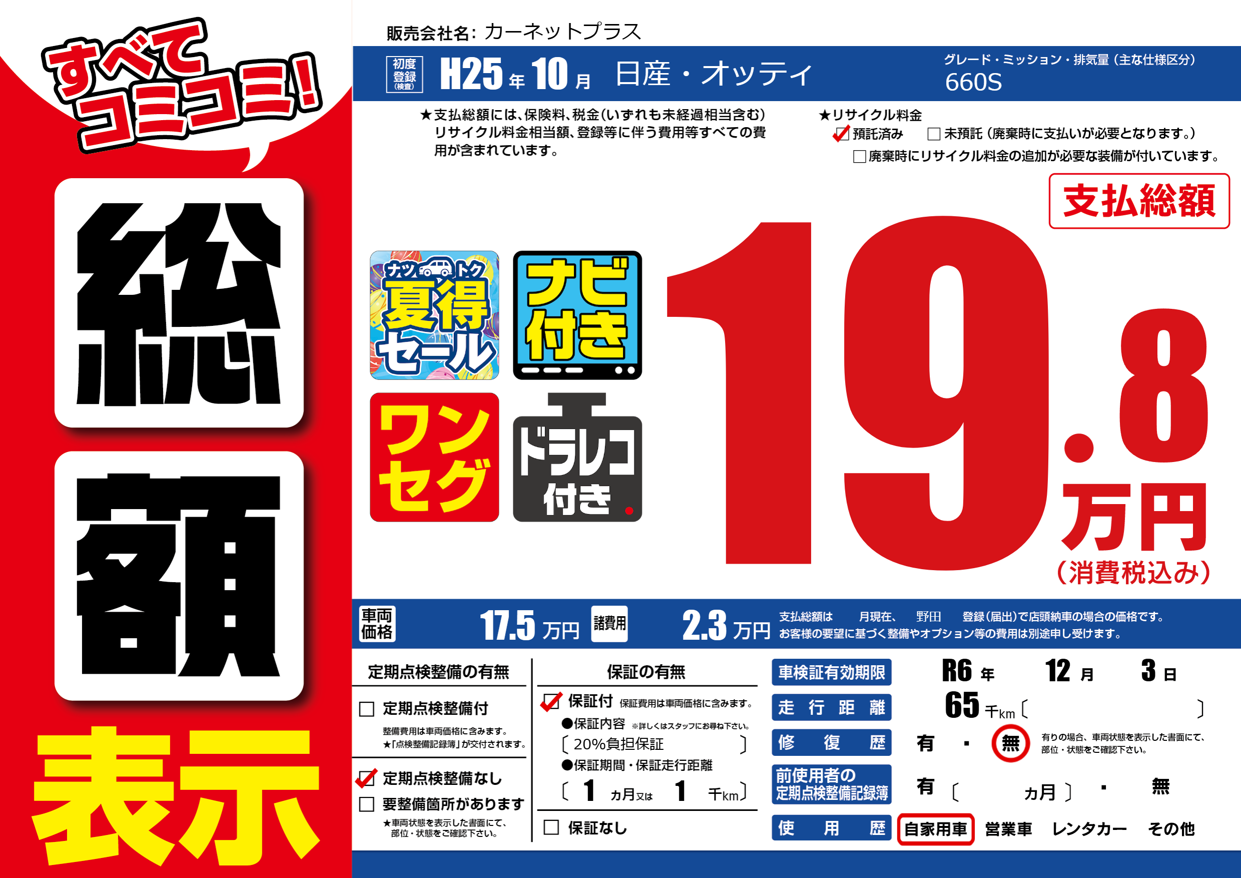 | 車名 | 日産・オッティ | グレード ミッション 排気量 |