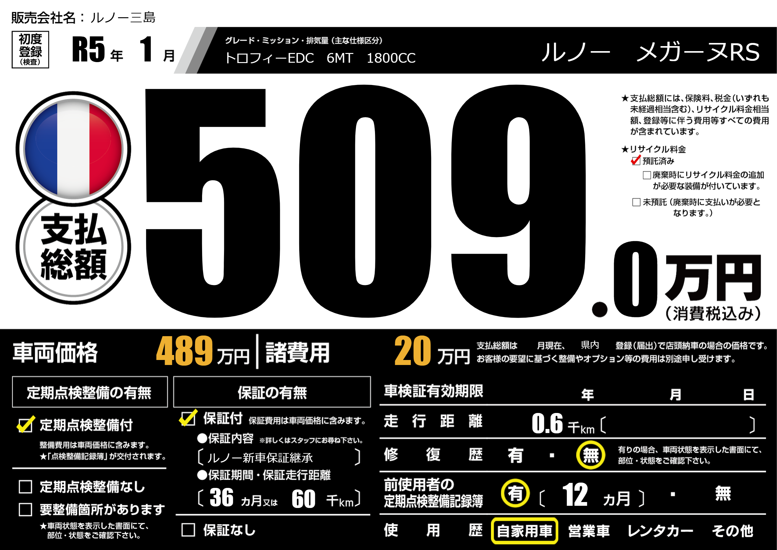 保証なし 保証内容(ルノー新車保証継承) 36ヶ月または(60)千kmまで |