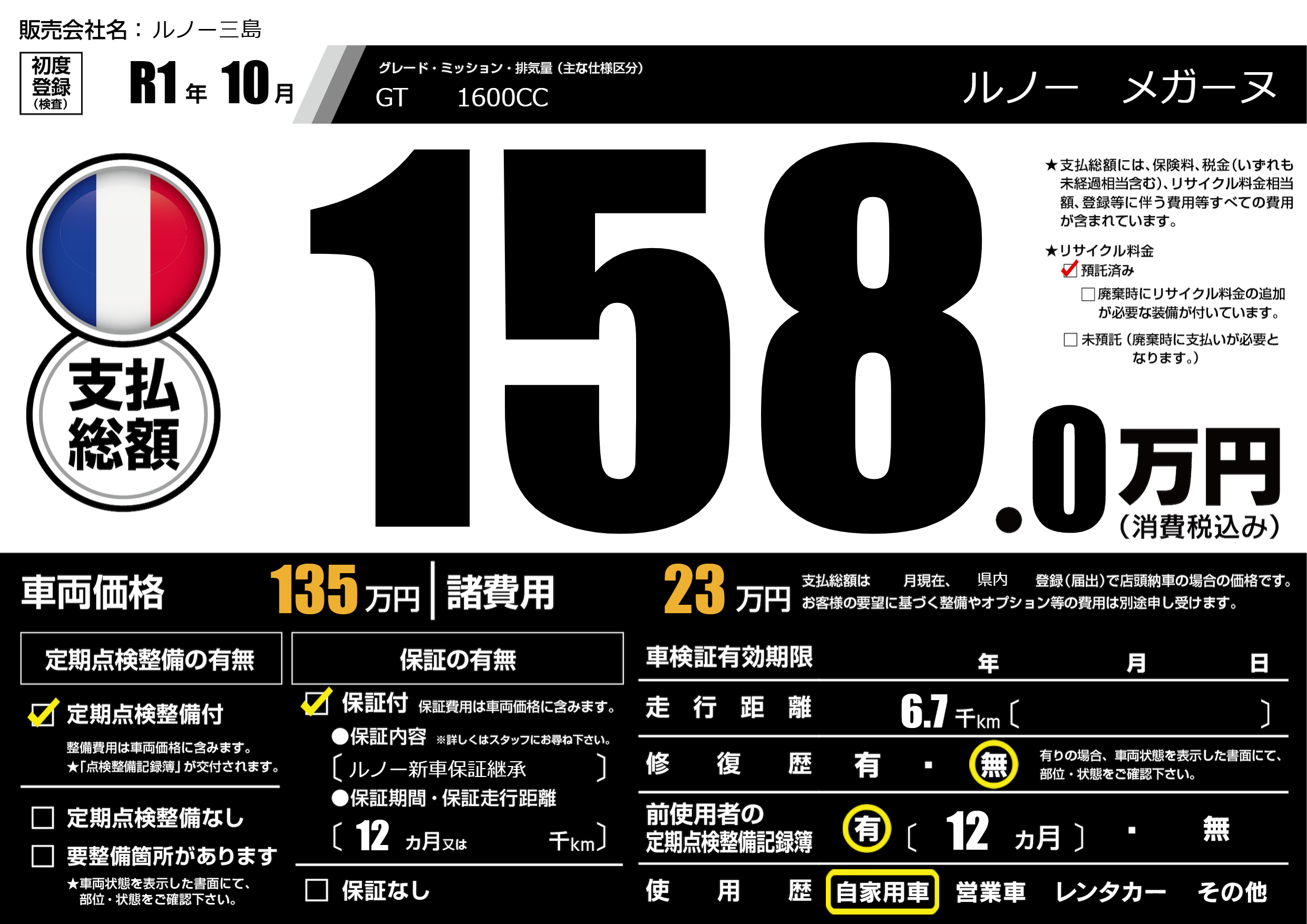 保証なし 保証内容(ルノー新車保証継承) 12ヶ月または千km |