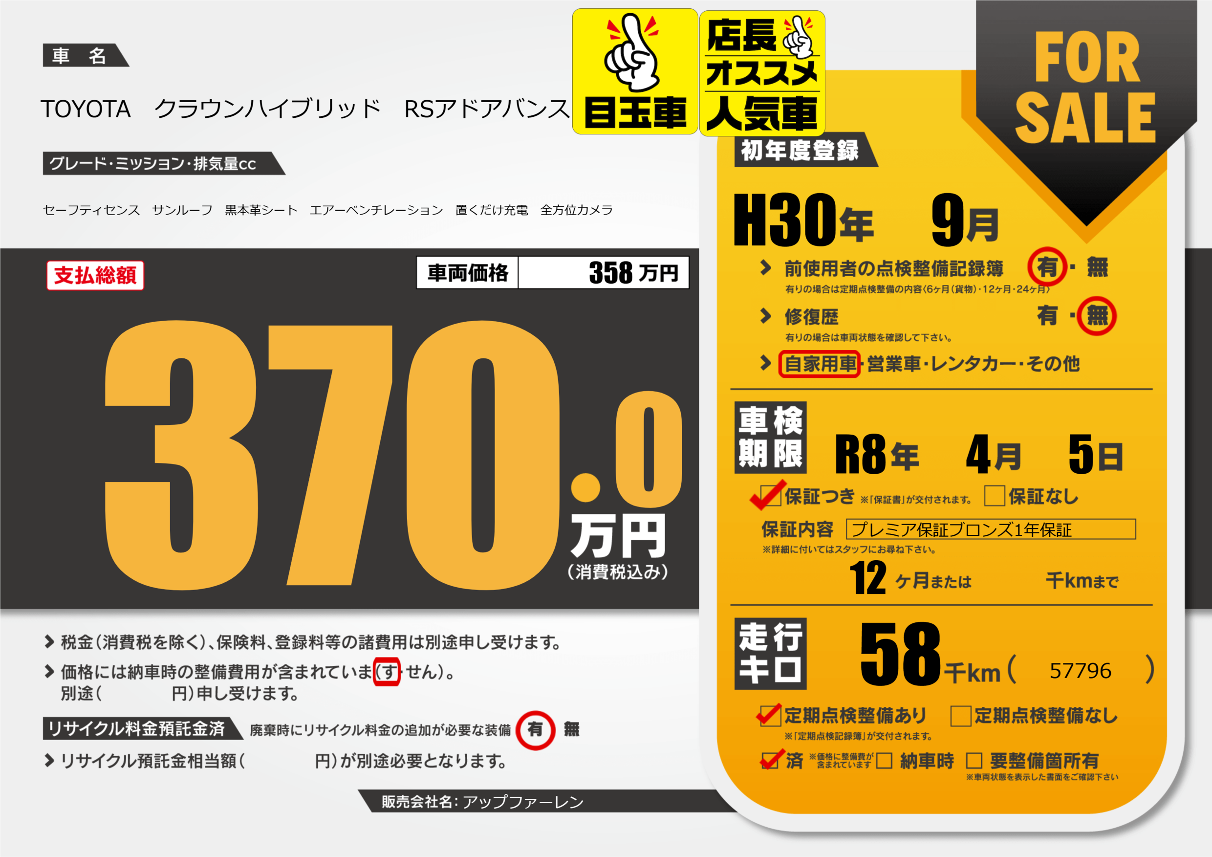 | 車名 | TOYOTA クラウンハイブリッド RSアドアバンス | グレード ミッション 排気量 |