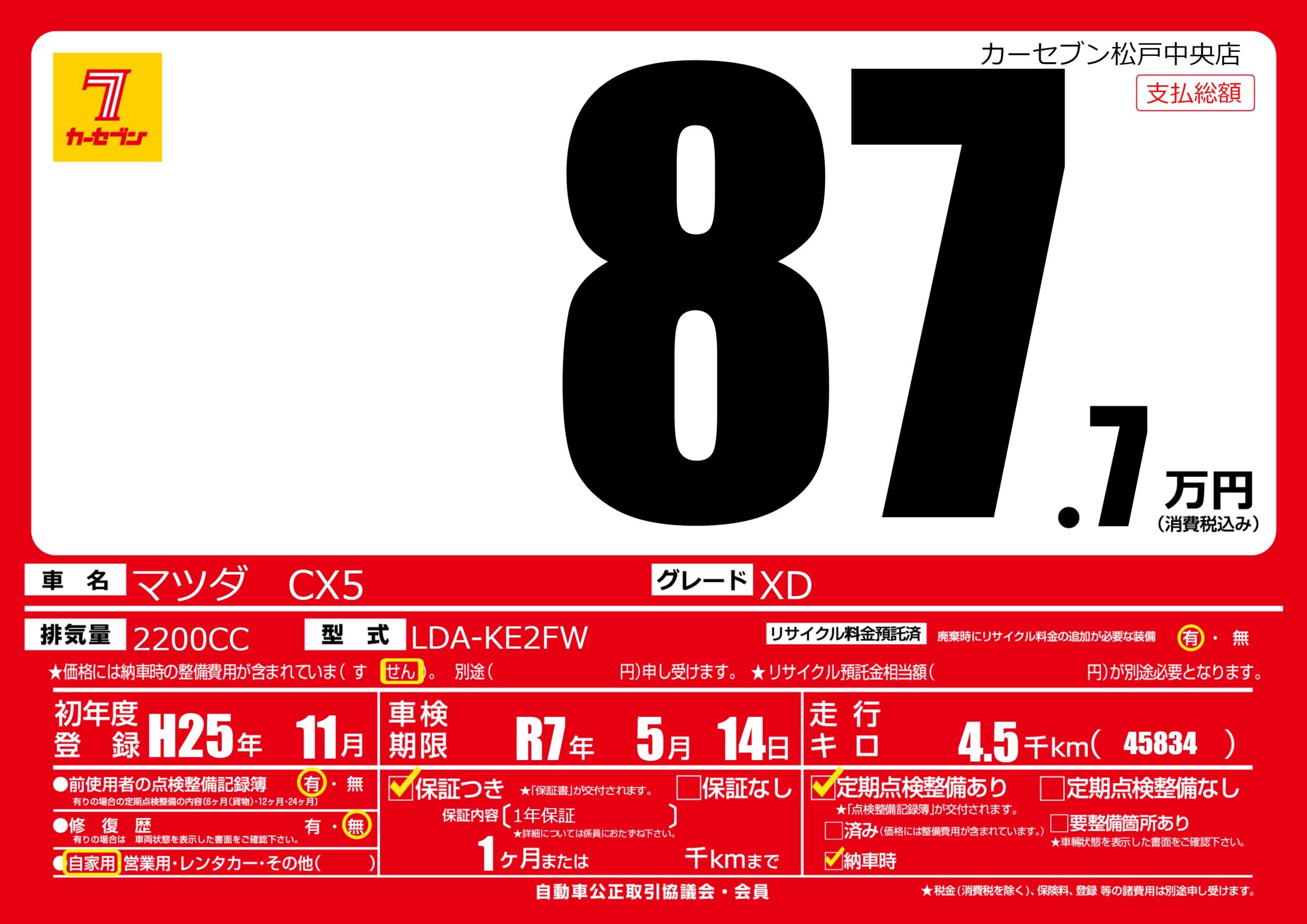 | 車名 | マツダ CX5 | グレード ミッション 排気量 |