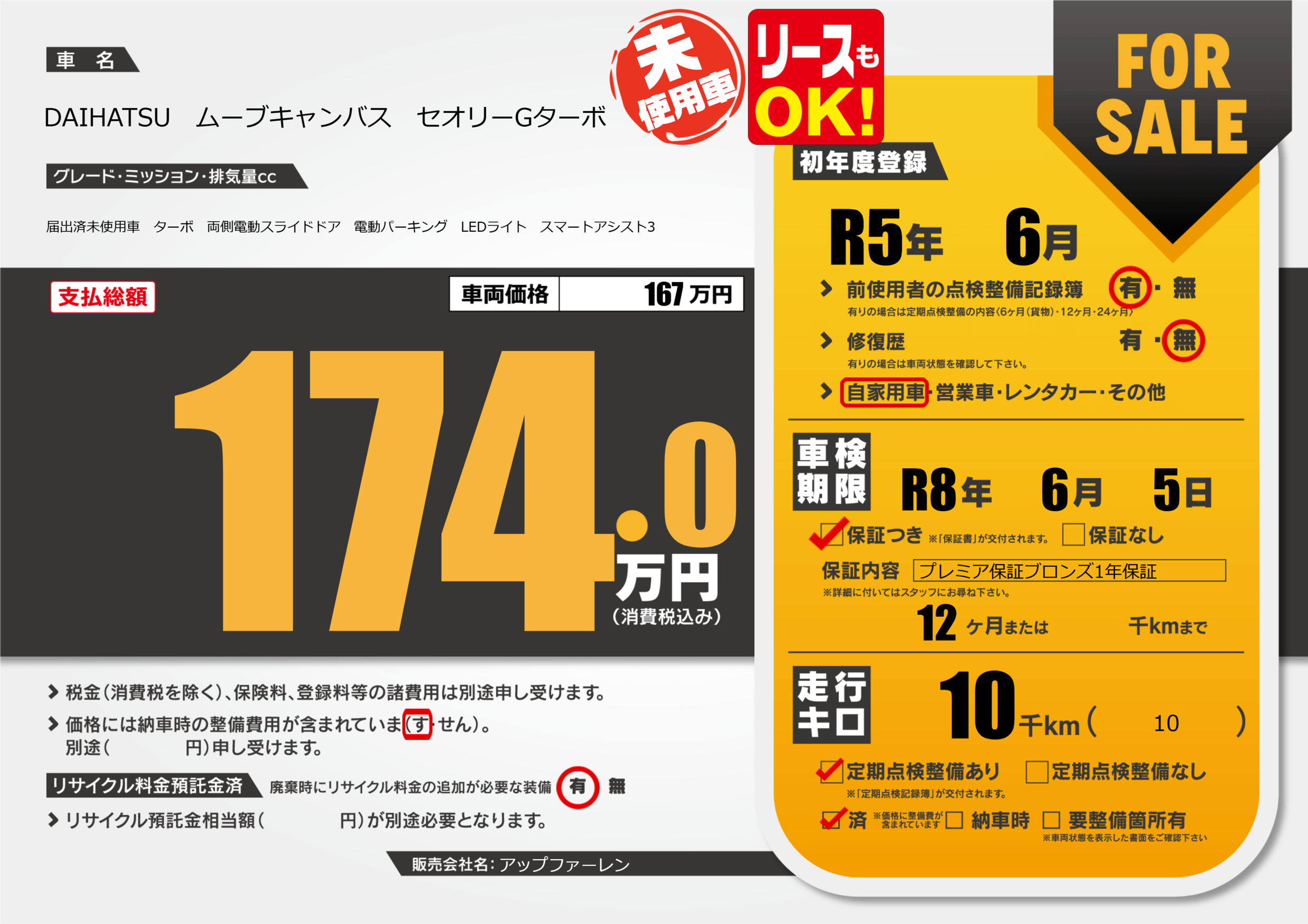 | 走行キロ | 1万km | 初年度登録 | R5年6月 |