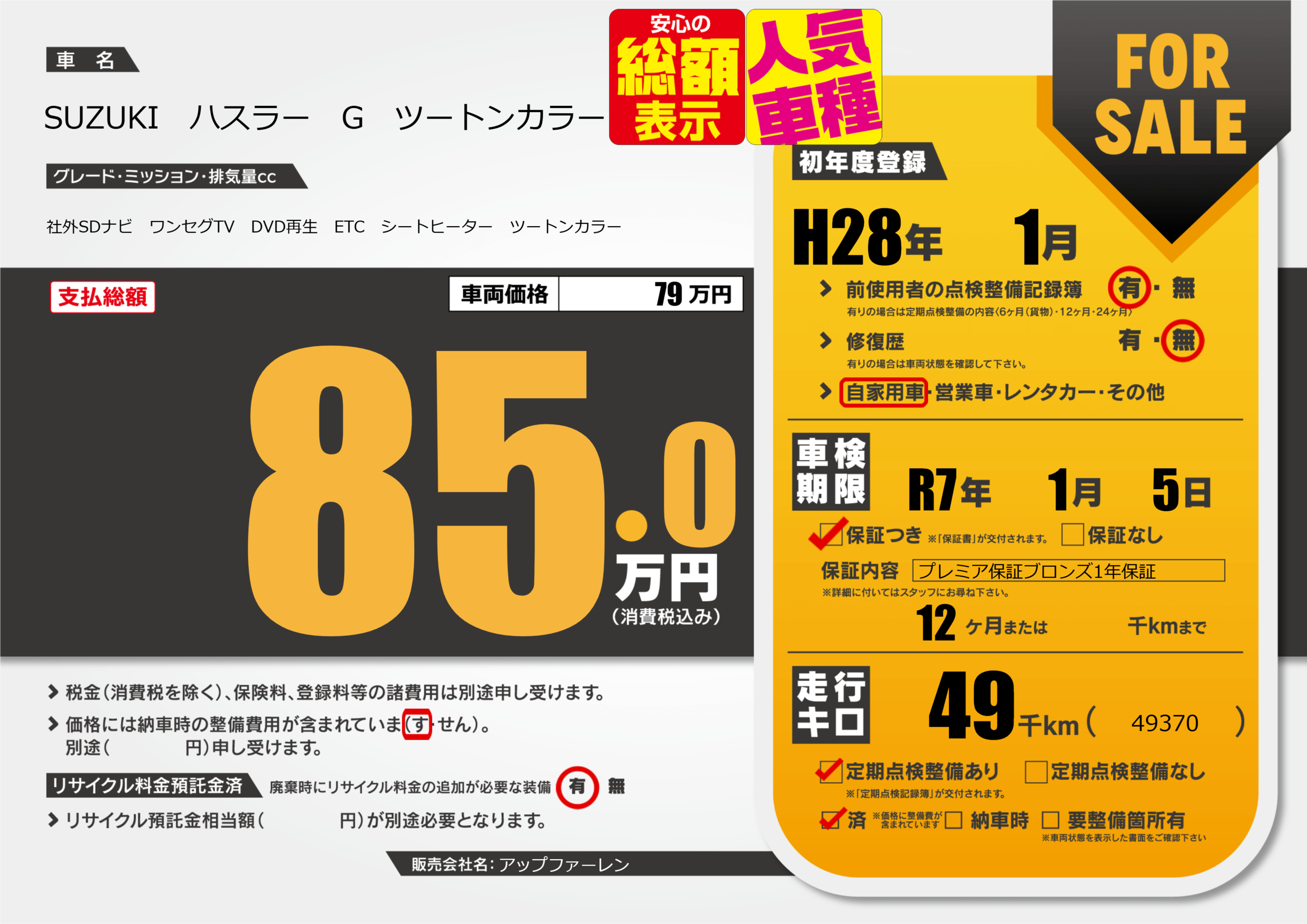 | 車名 | SUZUKI ハスラー G ツートンカラー | グレード ミッション 排気量 |