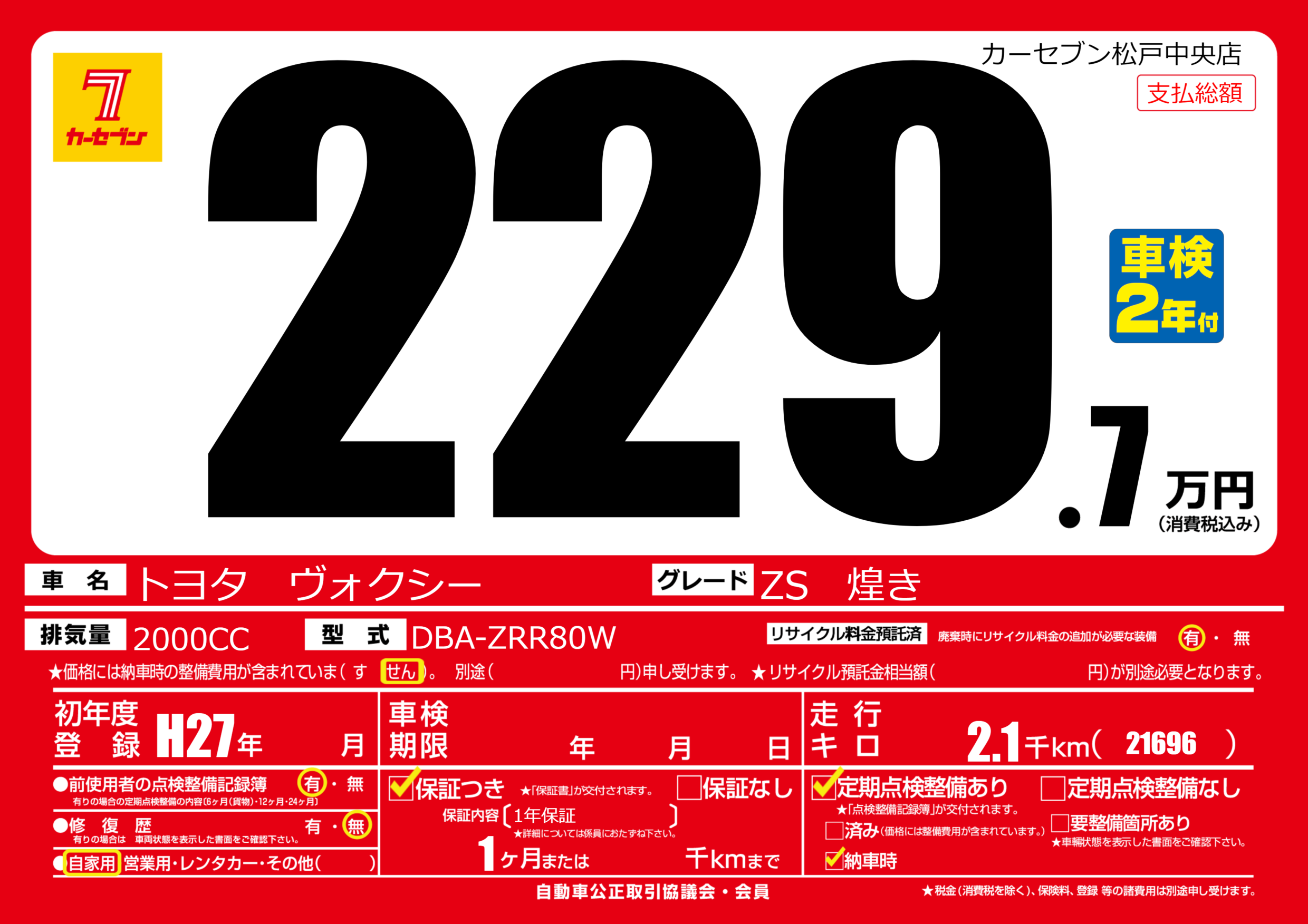 | 車名 | トヨタ ヴォクシー | グレード ミッション 排気量 |