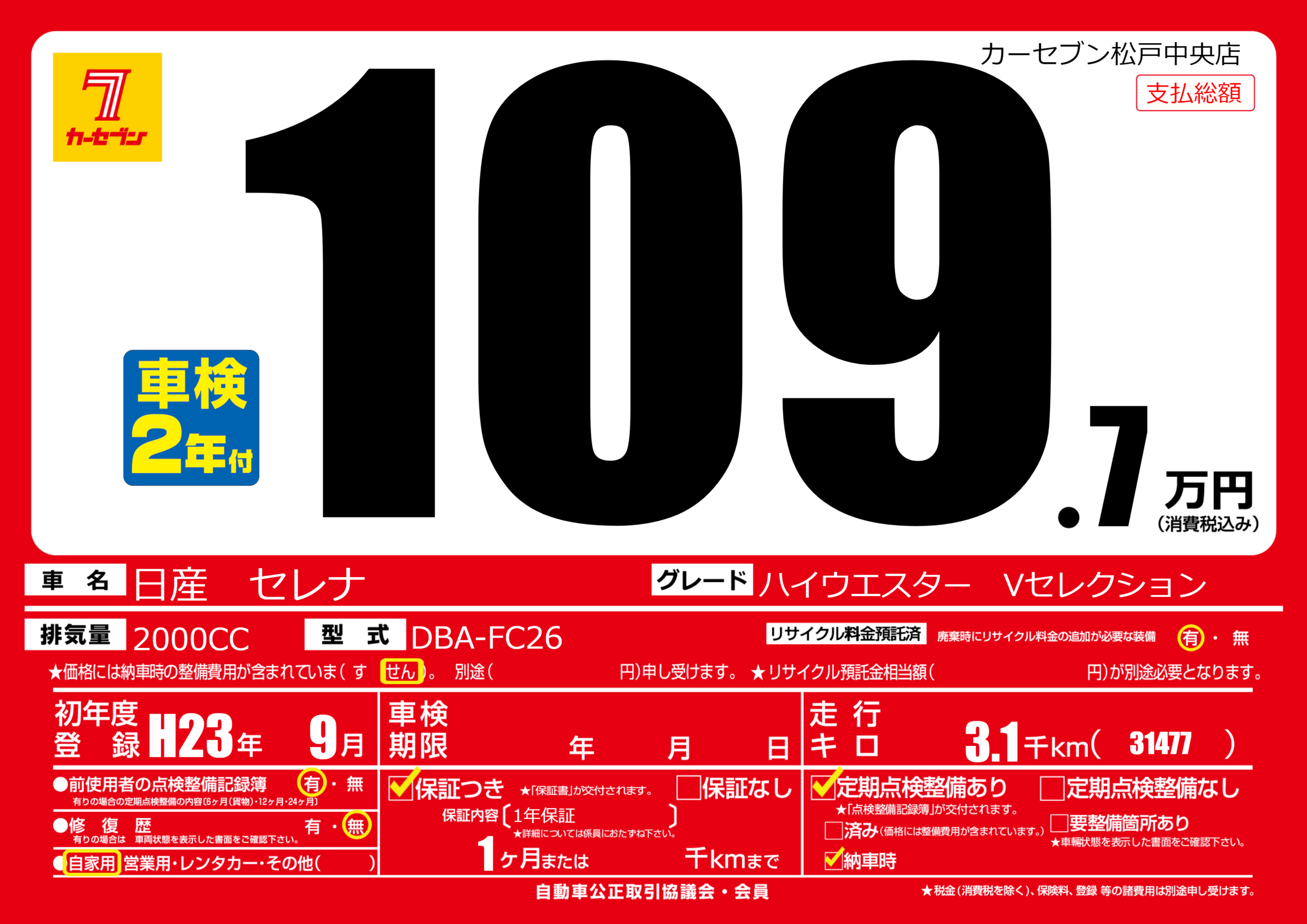 | 走行キロ | 0.3万km | 初年度登録 | H23年9月 |