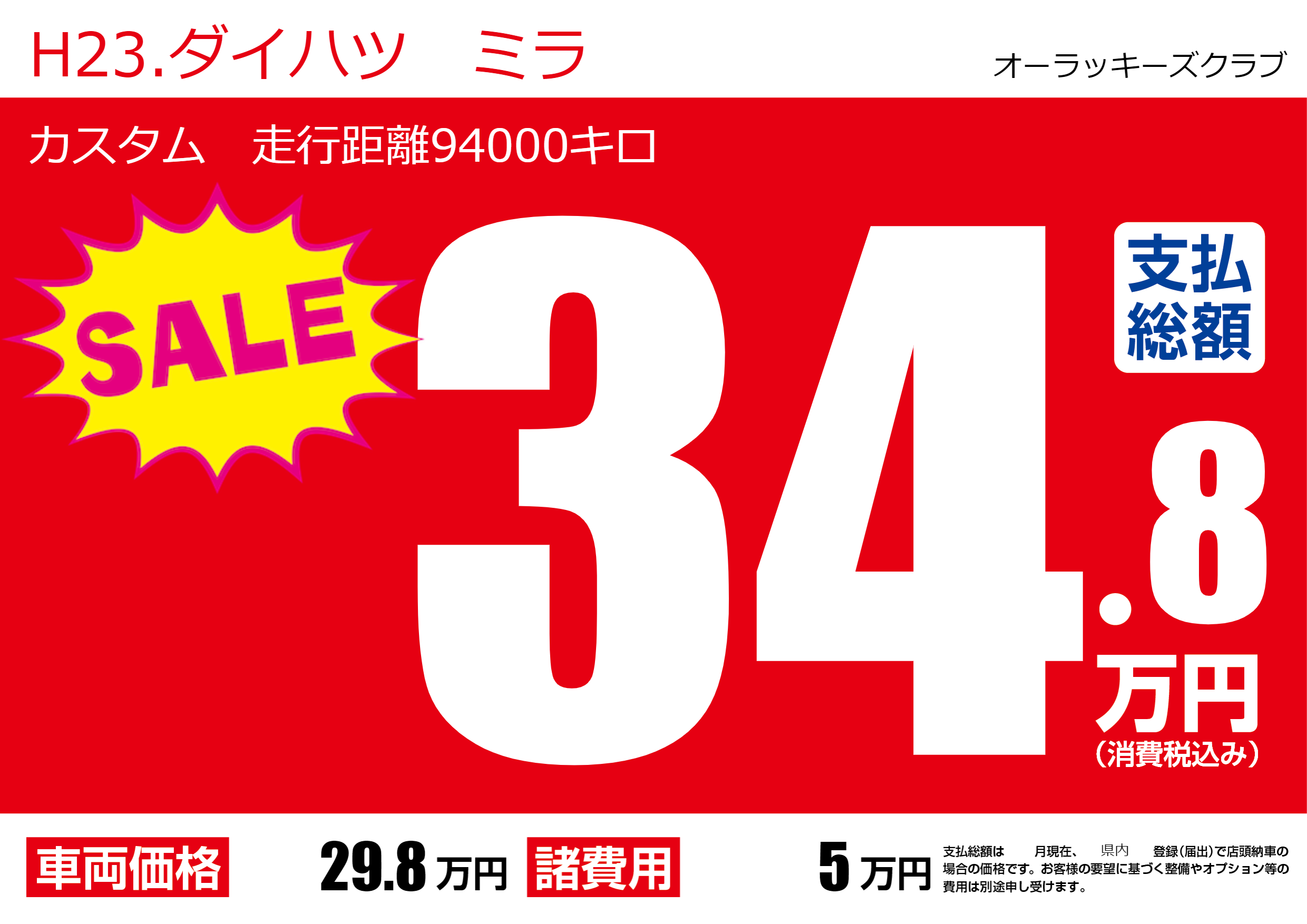 | 車名 | H23.ダイハツ ミラ | グレード ミッション 排気量 |