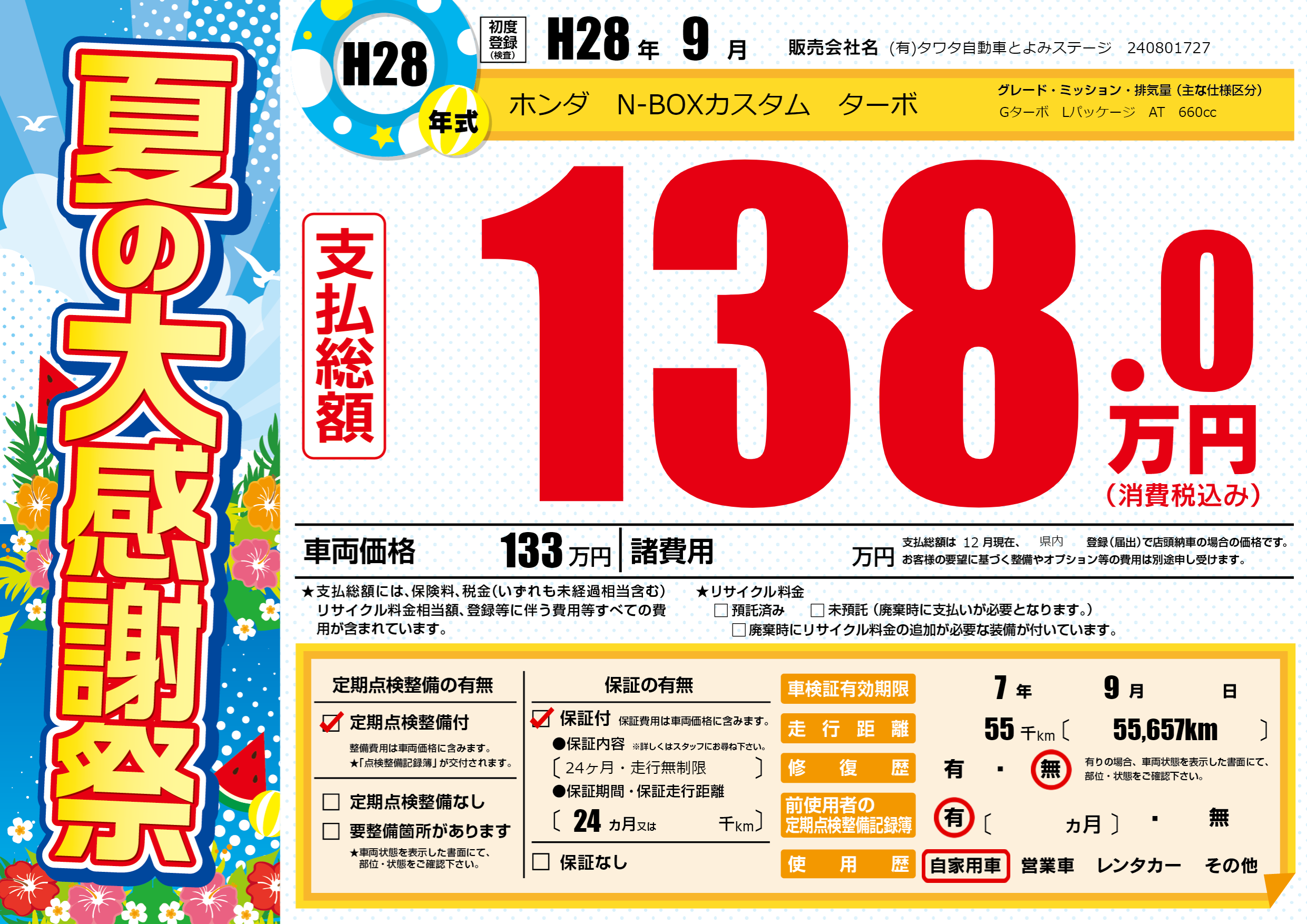 | 走行キロ | 5.5万km | 初年度登録 | H28年9月 |