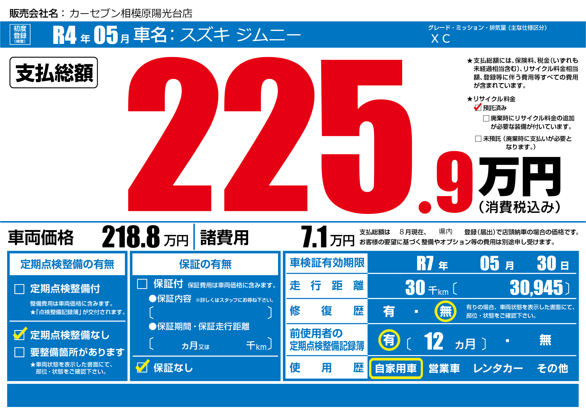 | 走行キロ | 3万km | 初年度登録 | R4年05月 |