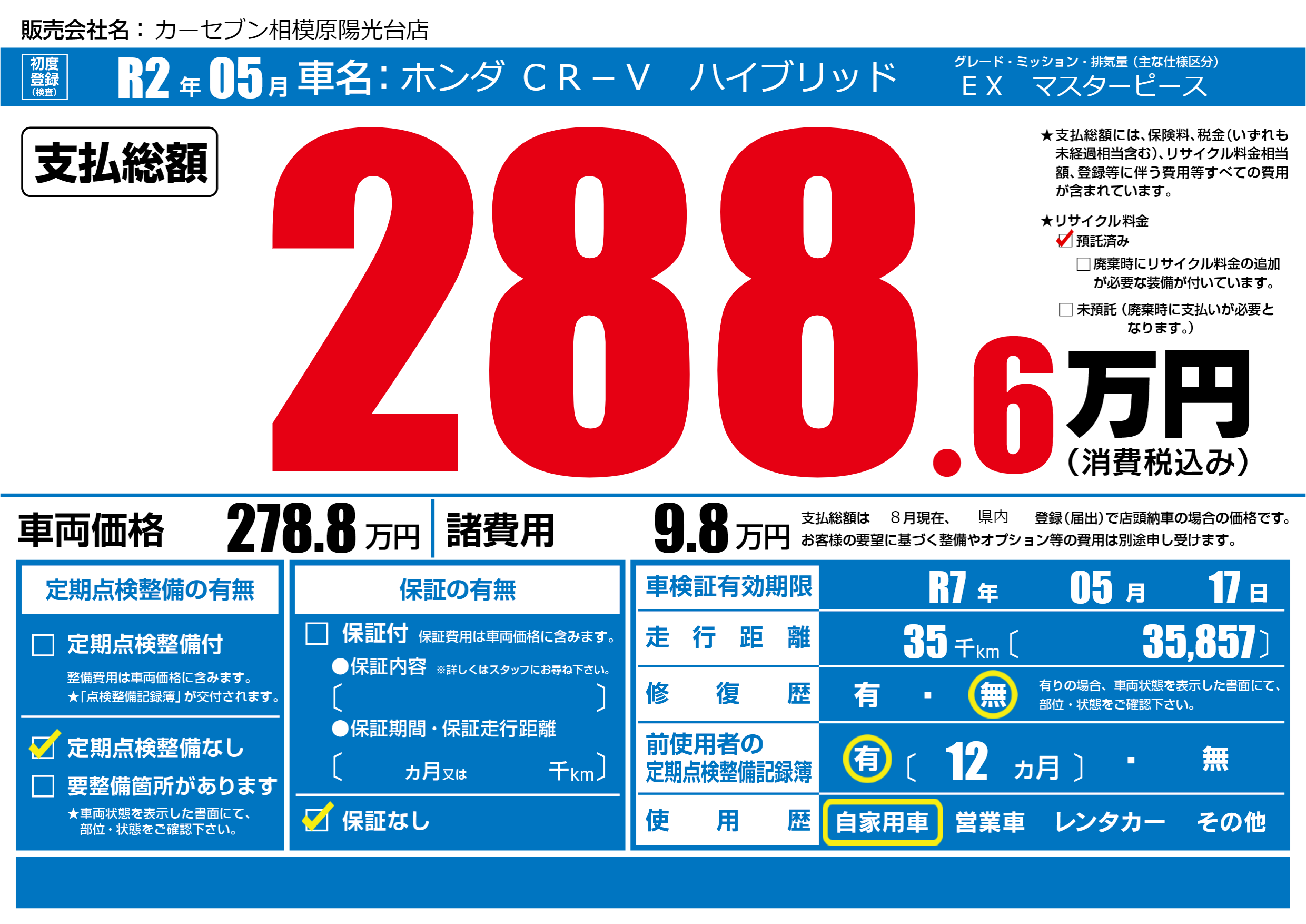 | 車名 | ホンダ CR-V ハイブリッド | グレード ミッション 排気量 |