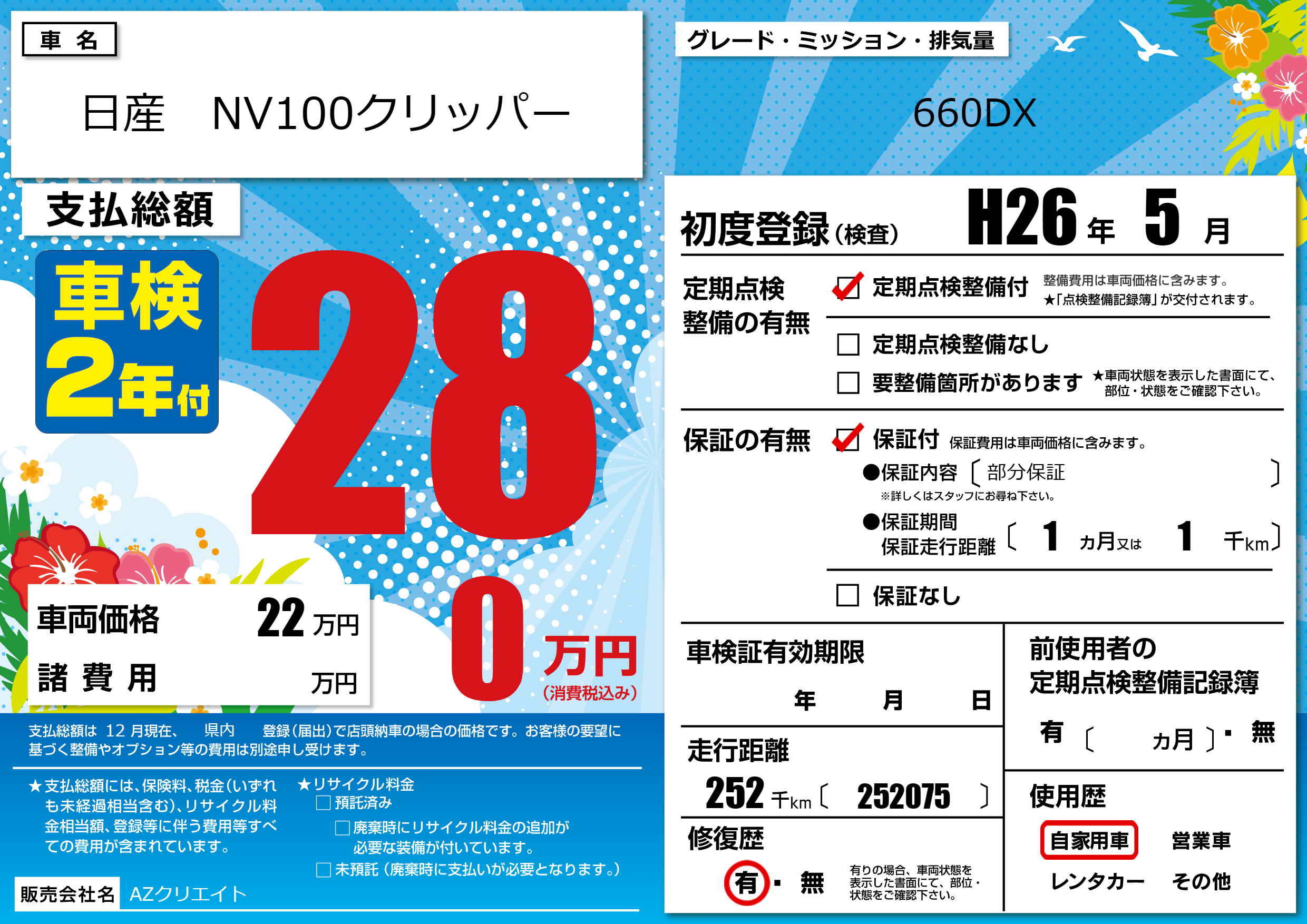 | 車名 | 日産 NV100クリッパー | グレード ミッション 排気量 |