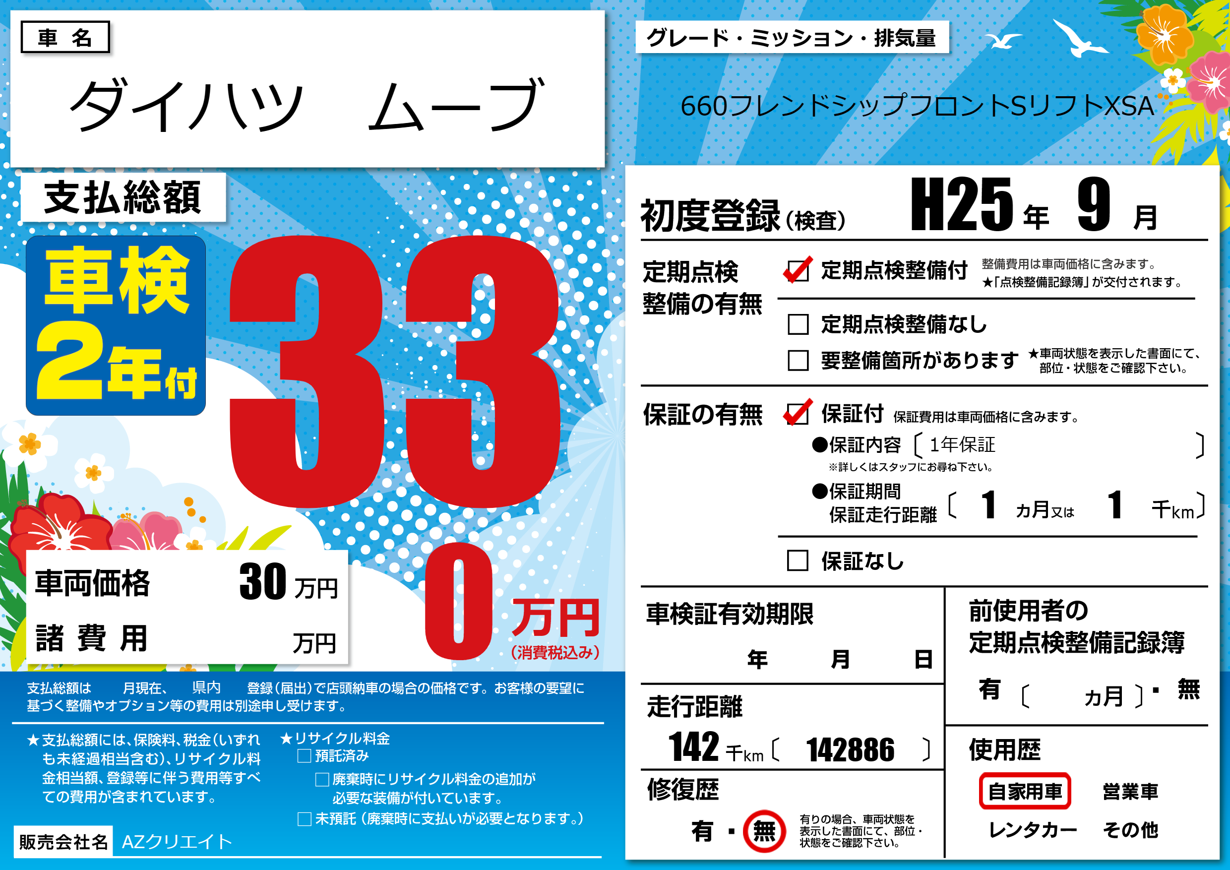 | 走行キロ | 14.2万km | 初年度登録 | H25年9月 |