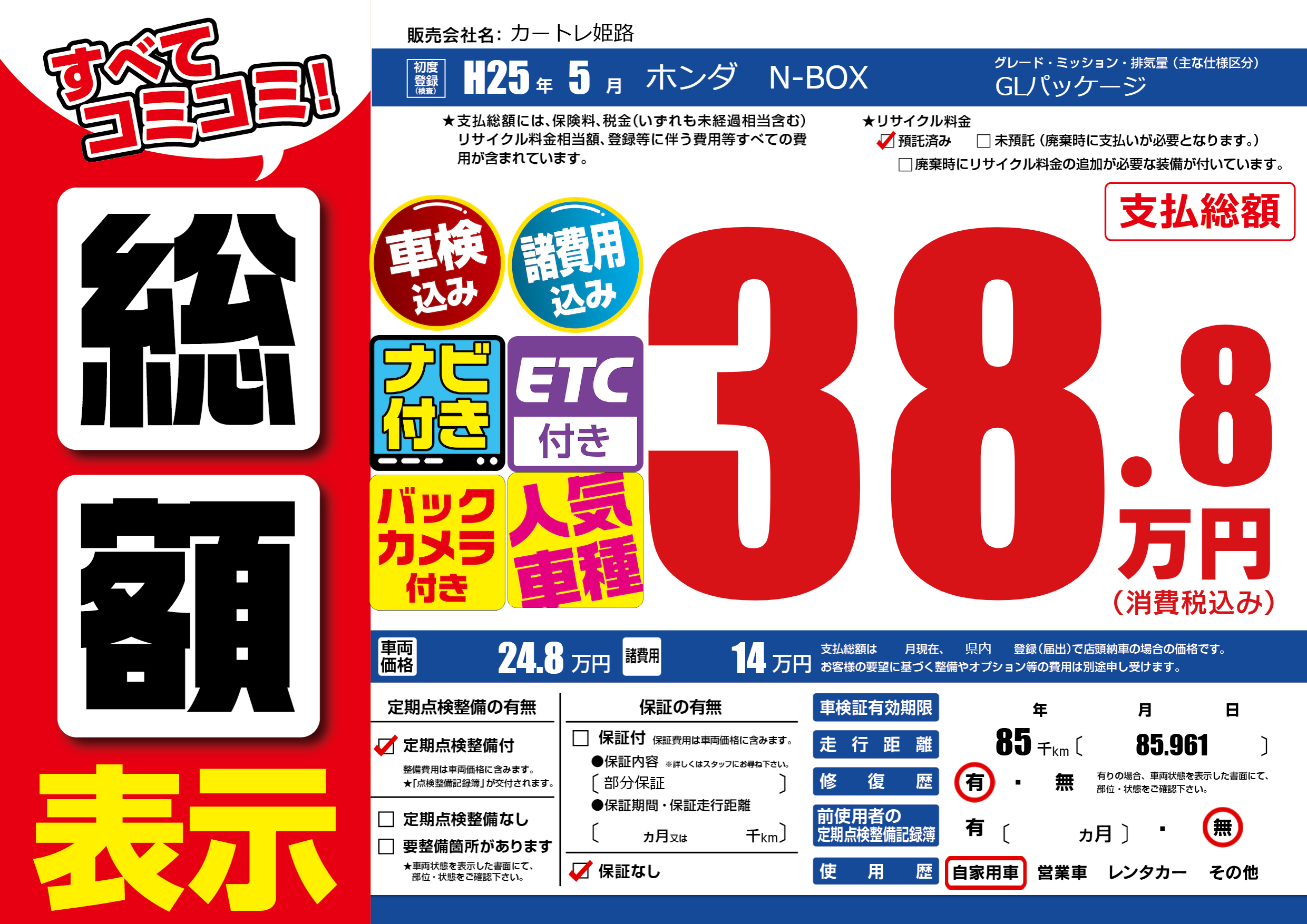 | 車名 | ホンダ N-BOX | グレード ミッション 排気量 |