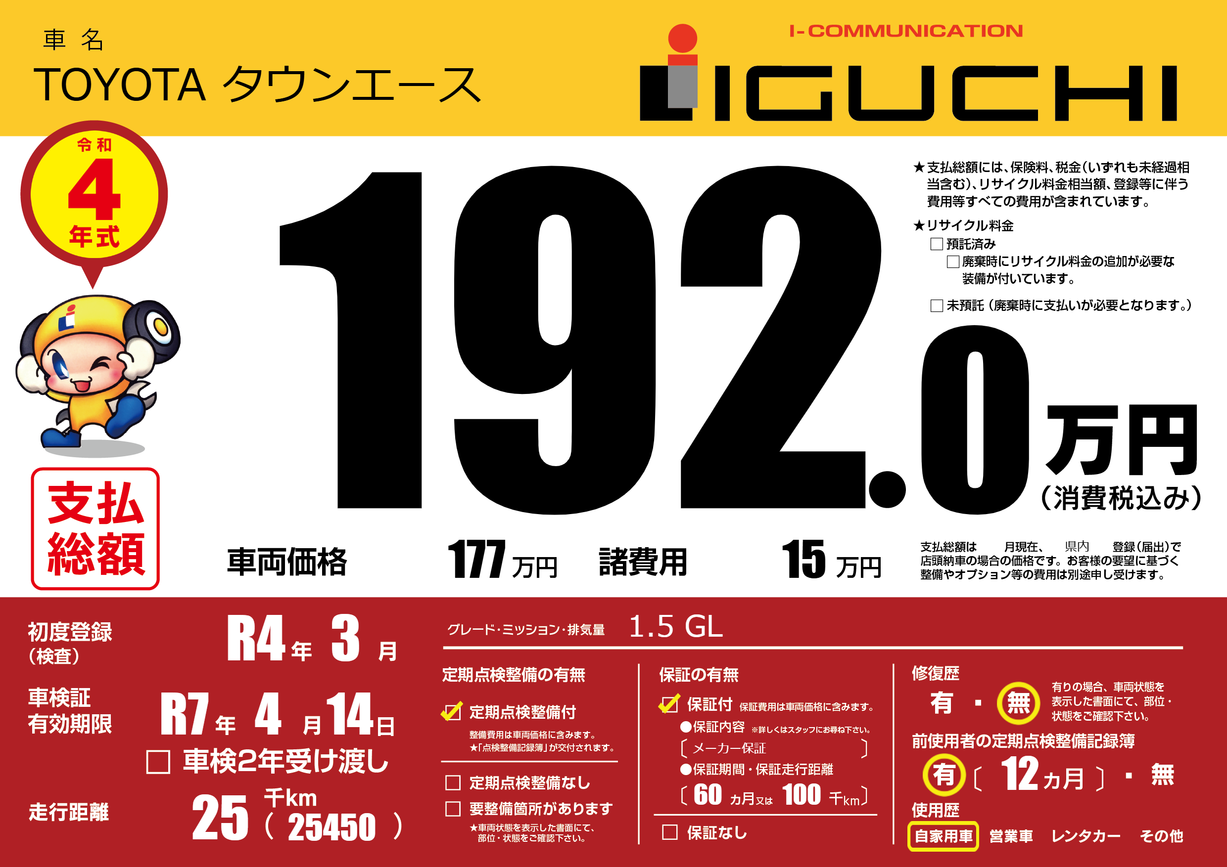 | 車名 | TOYOTA タウンエース | グレード ミッション 排気量 |