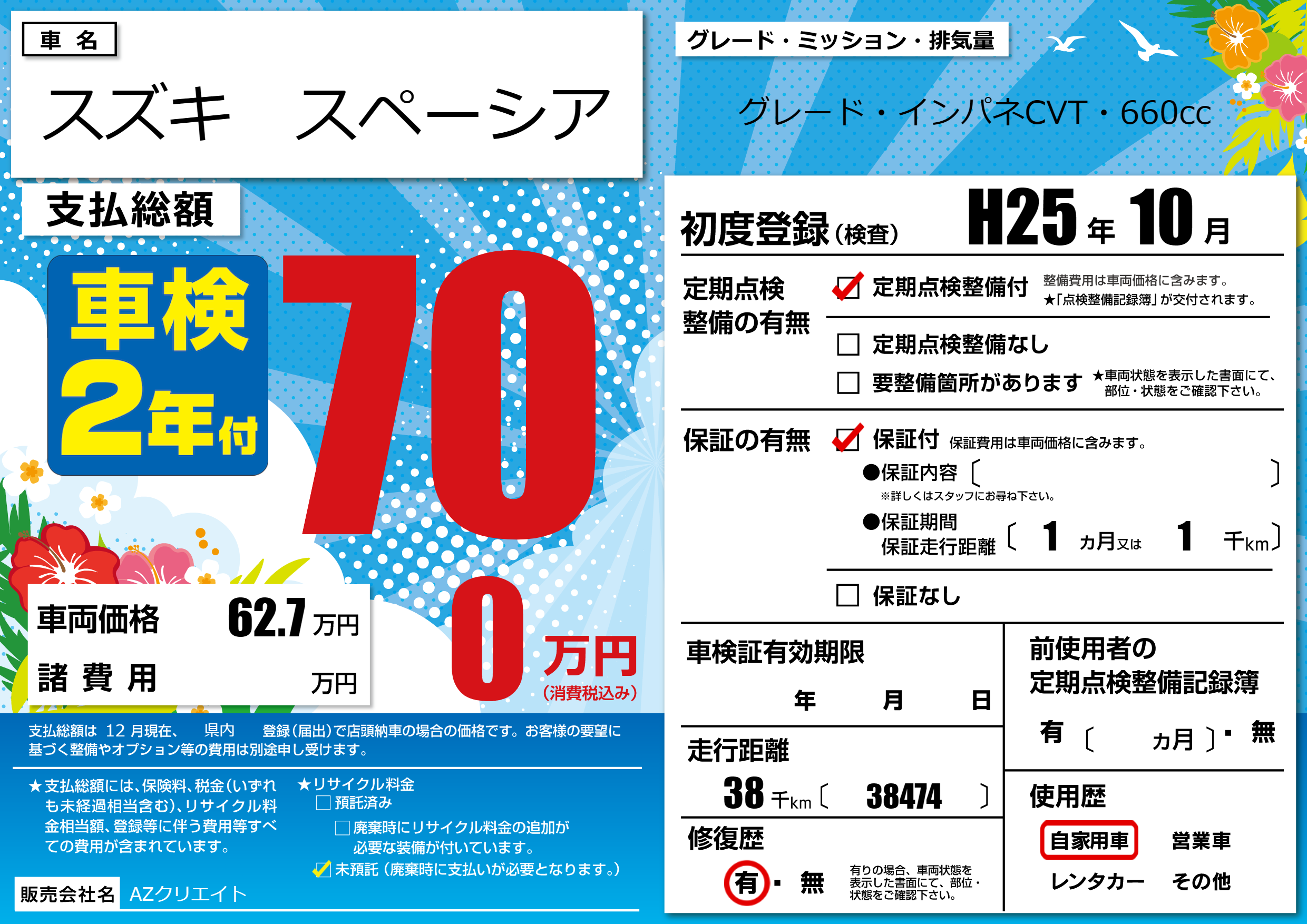 | 車名 | スズキ スペーシア | グレード ミッション 排気量 |