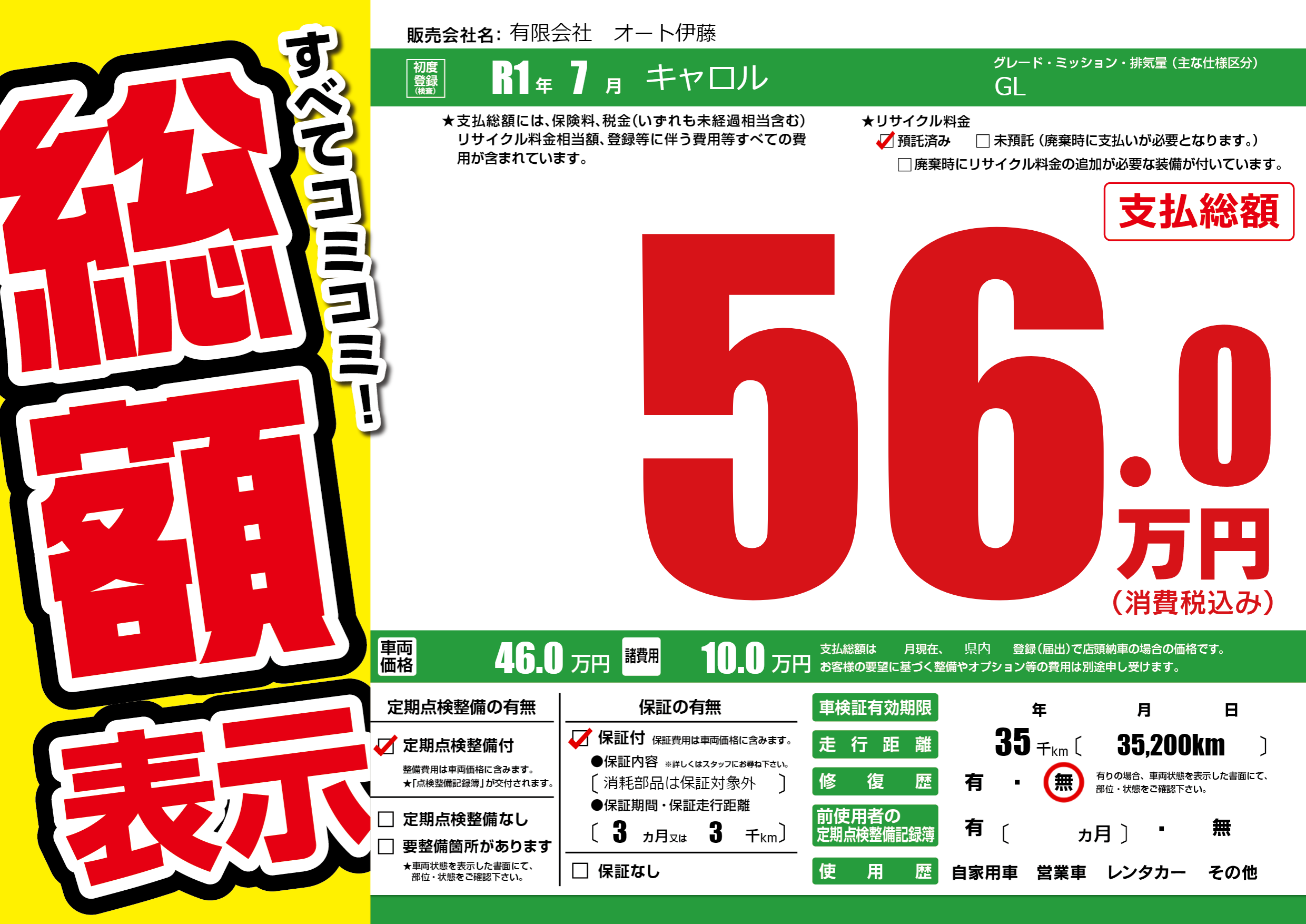 | 車名 | キャロル | グレード ミッション 排気量 |