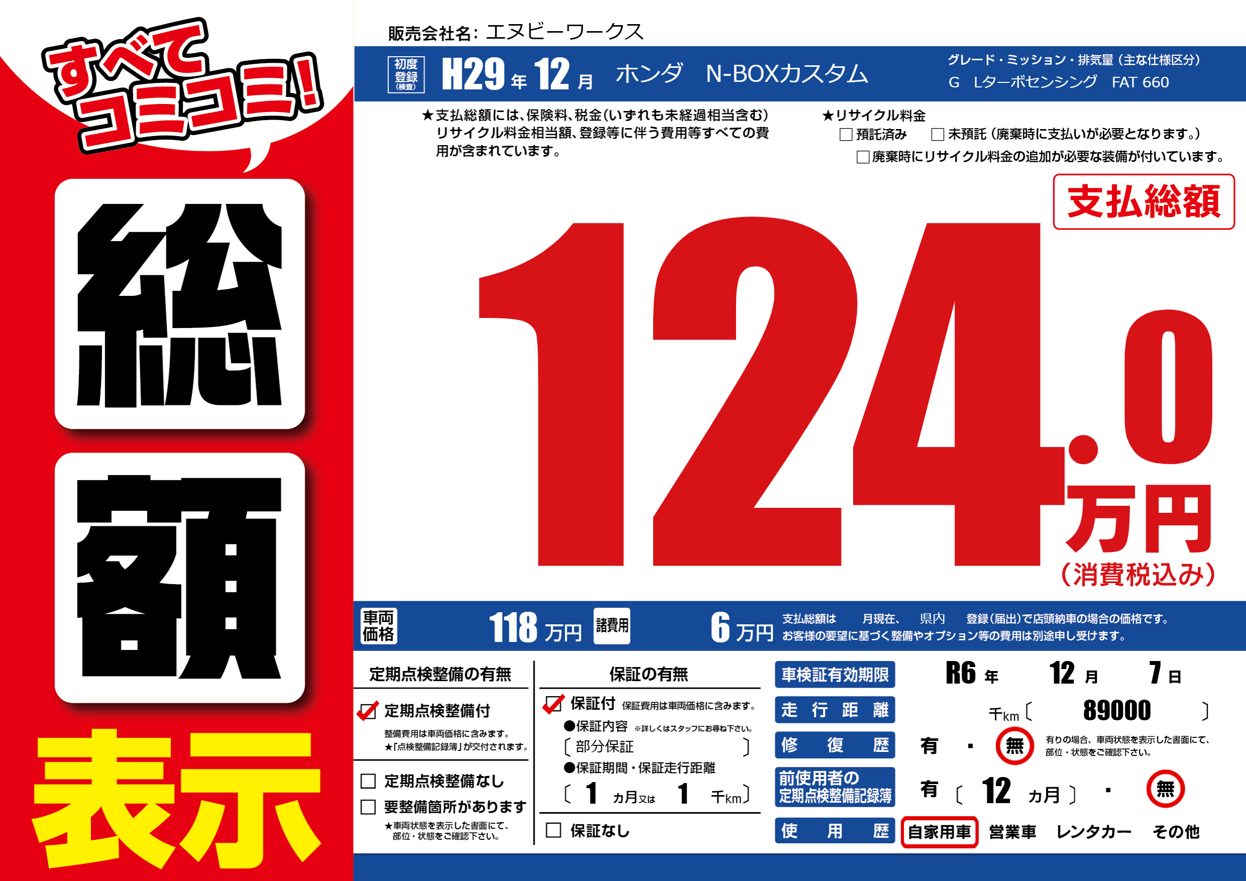 | 車名 | ホンダ N-BOXカスタム | グレード ミッション 排気量 |