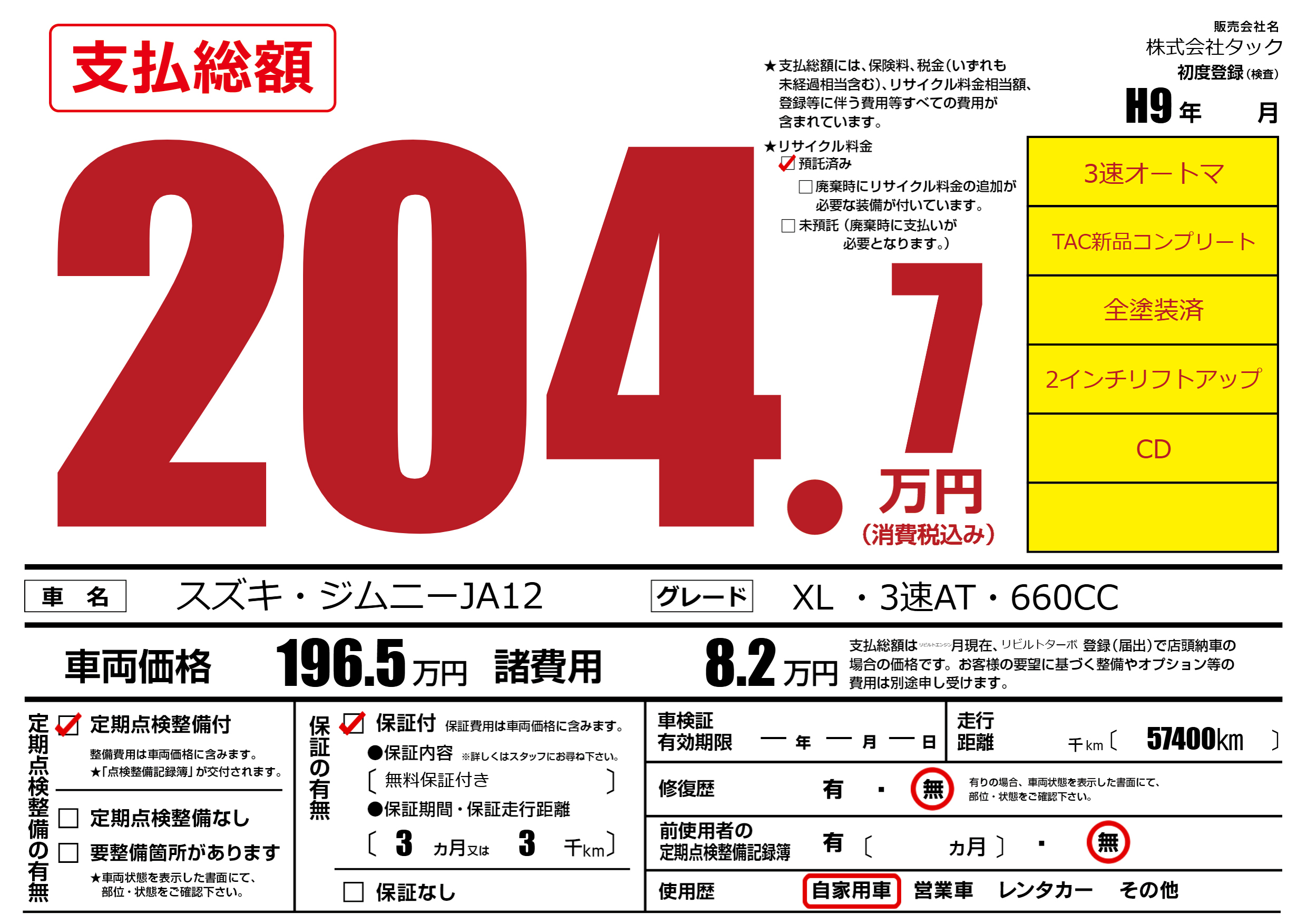 | 車名 | スズキ・ジムニーJA12 | グレード ミッション 排気量 |
