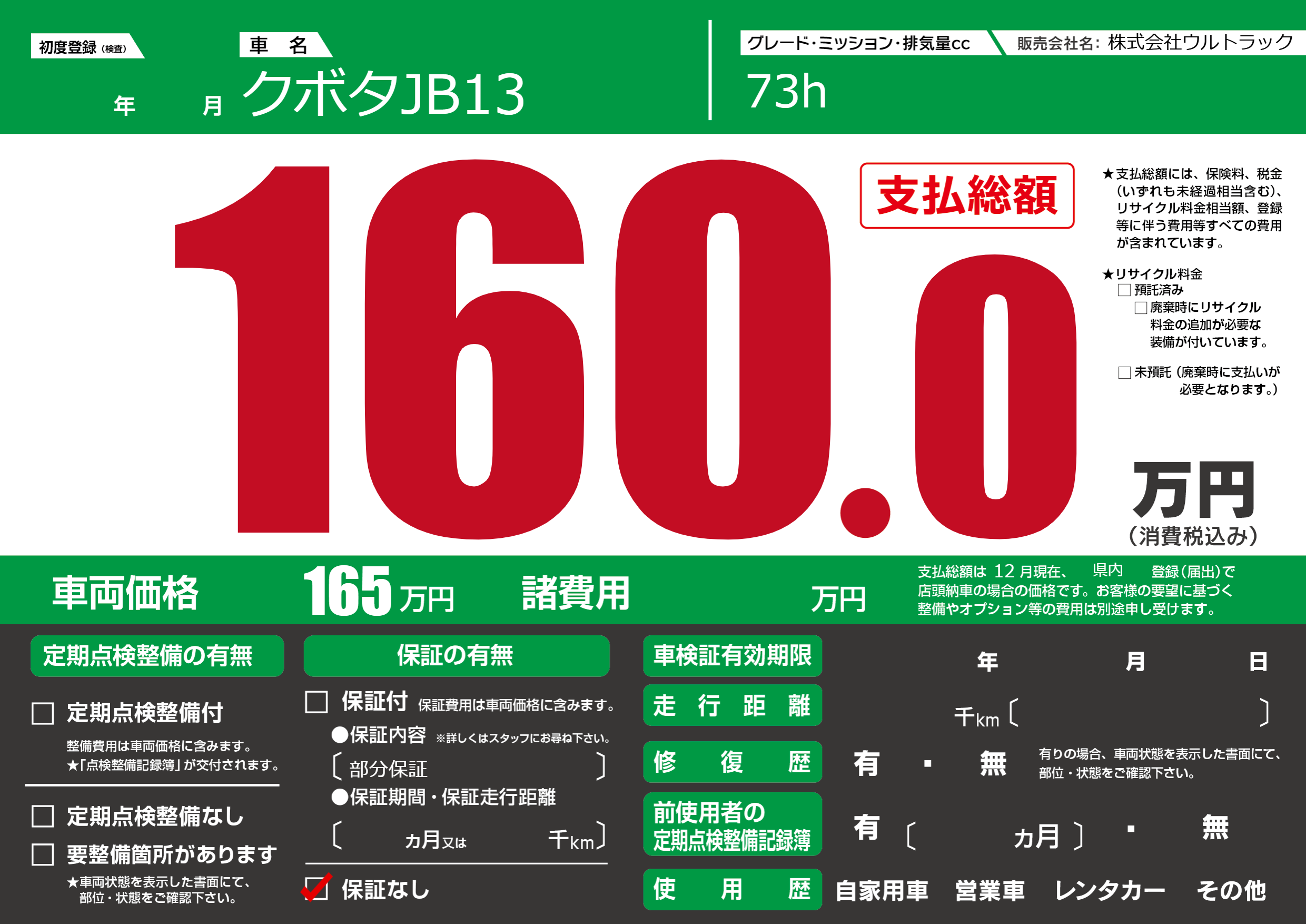 | 車名 | クボタJB13 | グレード ミッション 排気量 |