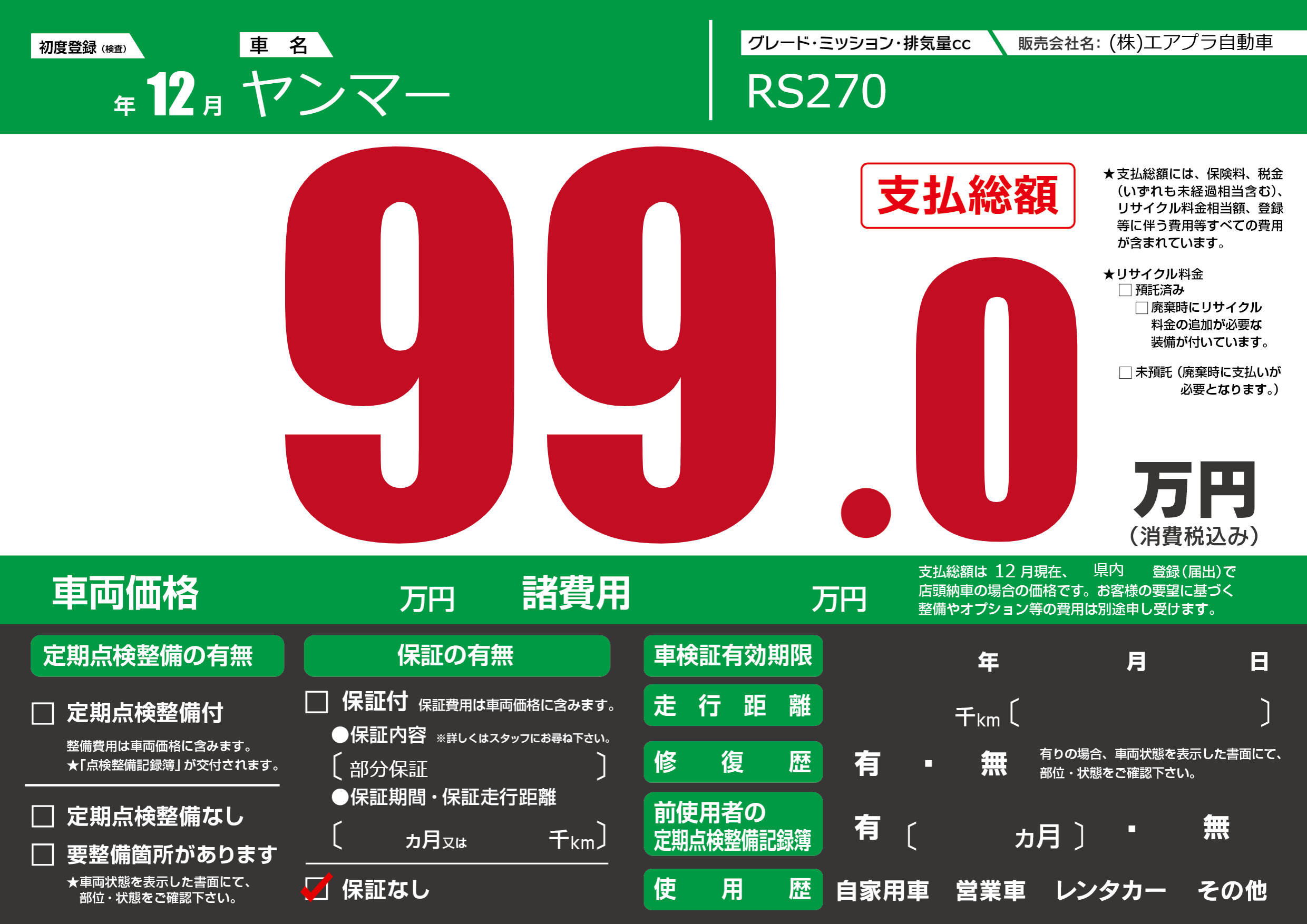 保証なし 保証内容(部分保証) ---ヶ月または()千kmまで |