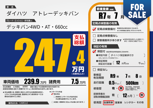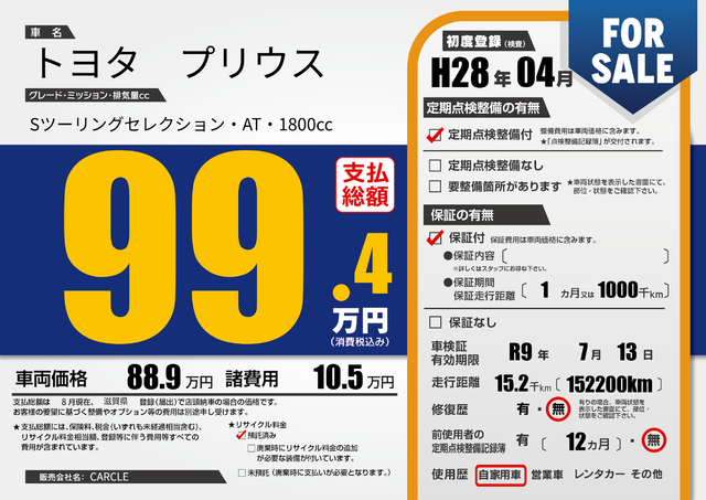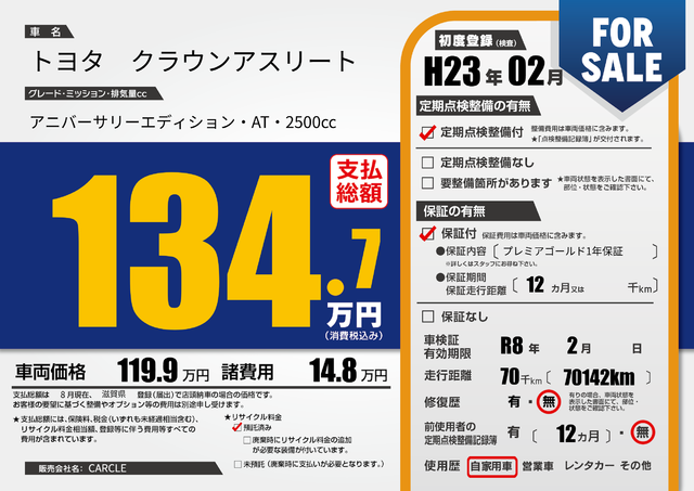 | 走行キロ | 9.3万km | 初年度登録 | H23年12月 |