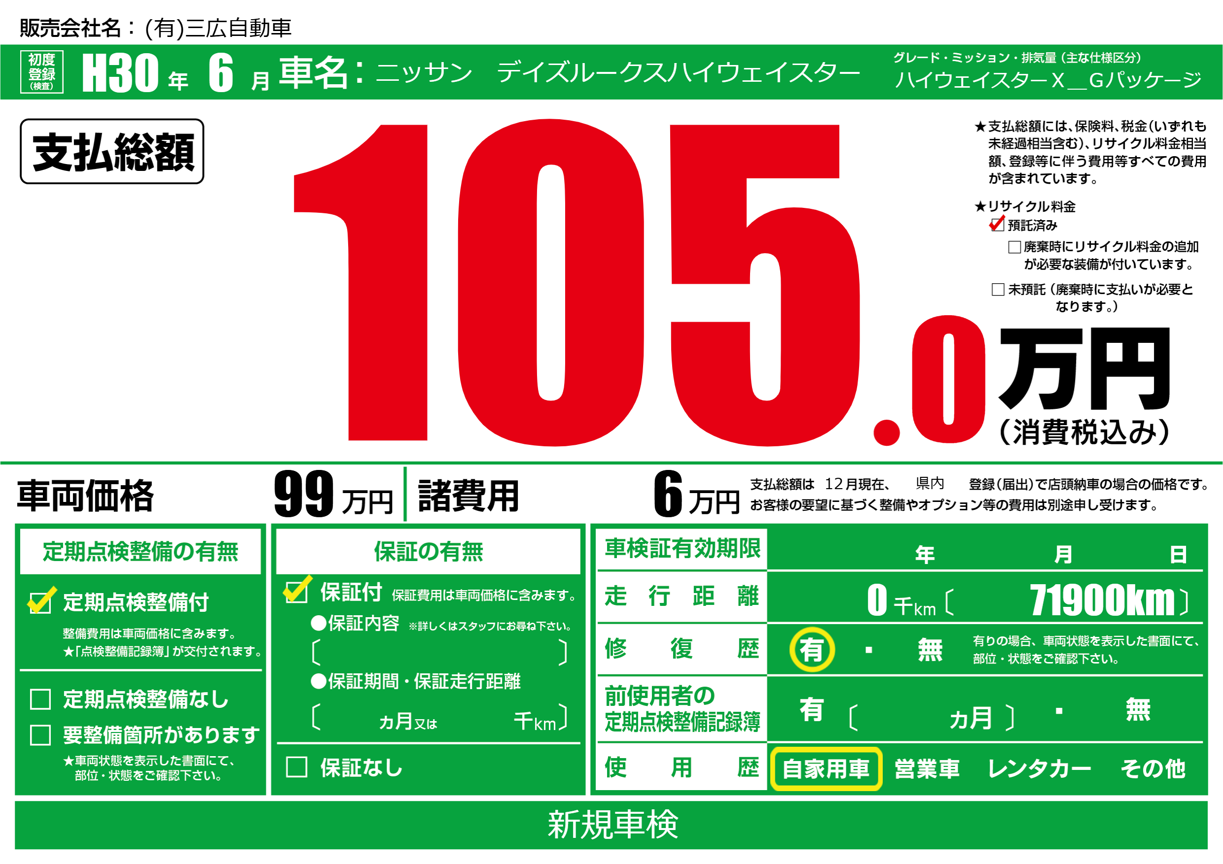 | 走行キロ | - | 初年度登録 | H30年6月 |