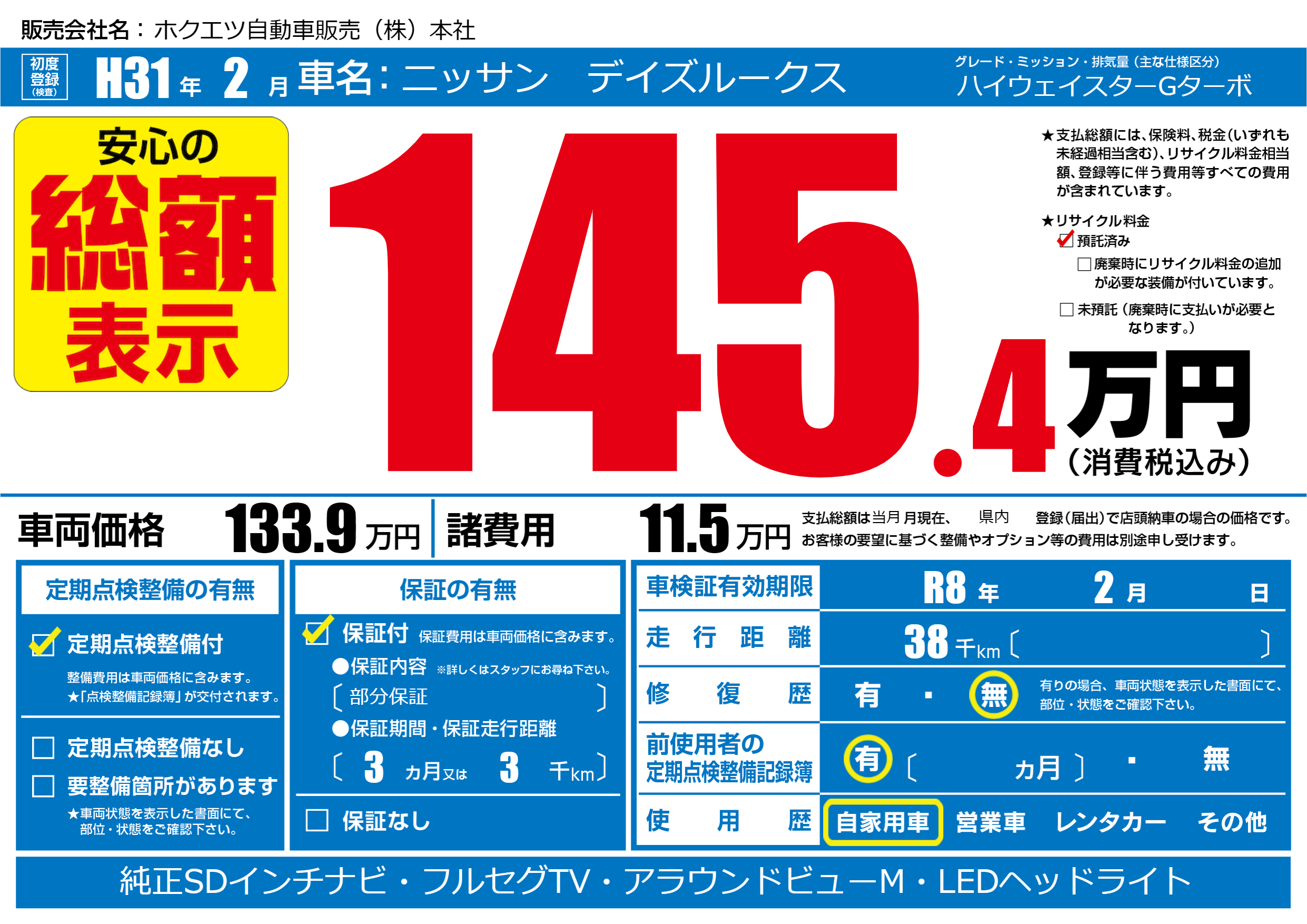 | 車名 | ニッサン デイズルークス | グレード ミッション 排気量 |