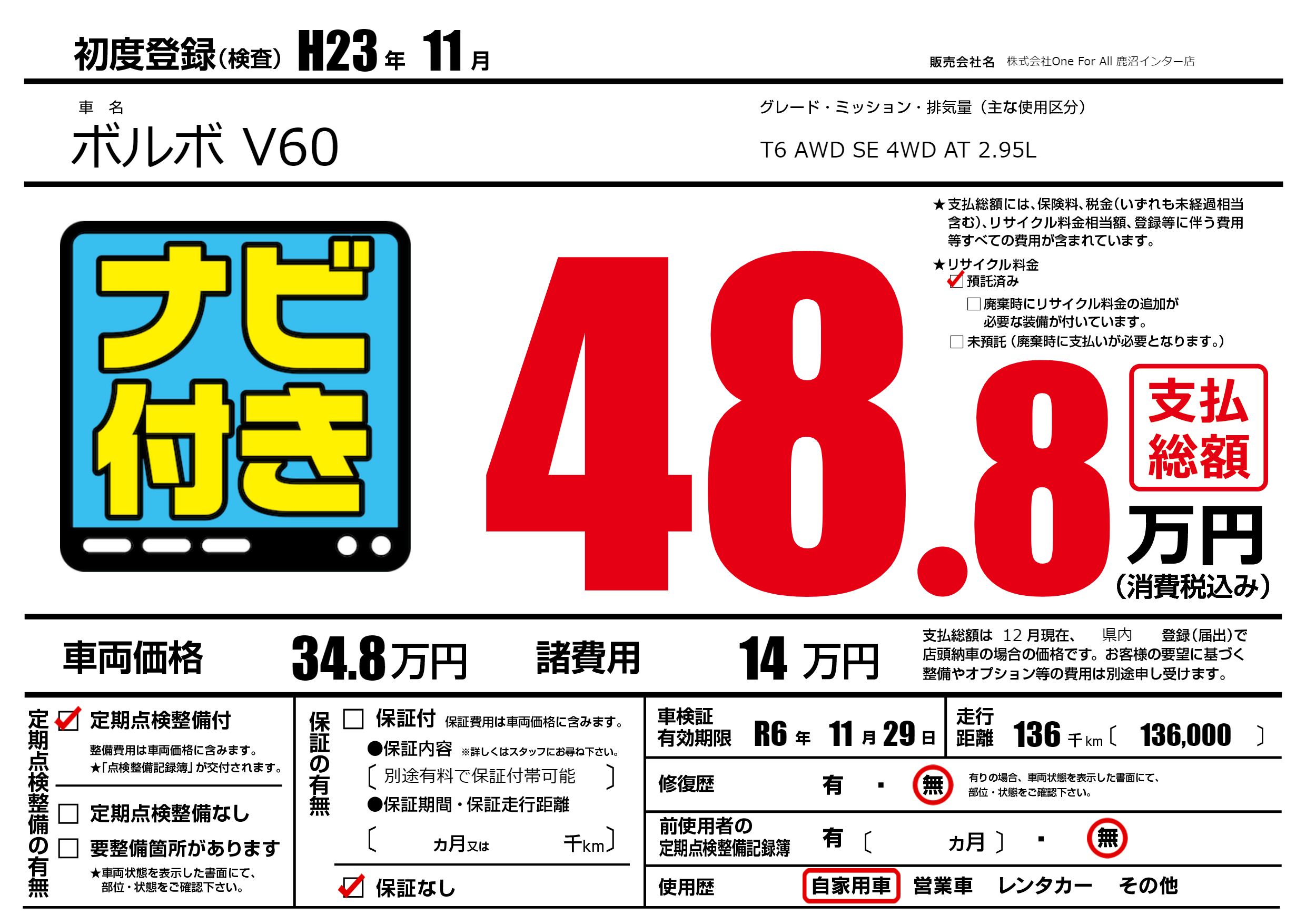 | 走行キロ | 13.6万km | 初年度登録 | H23年11月 |