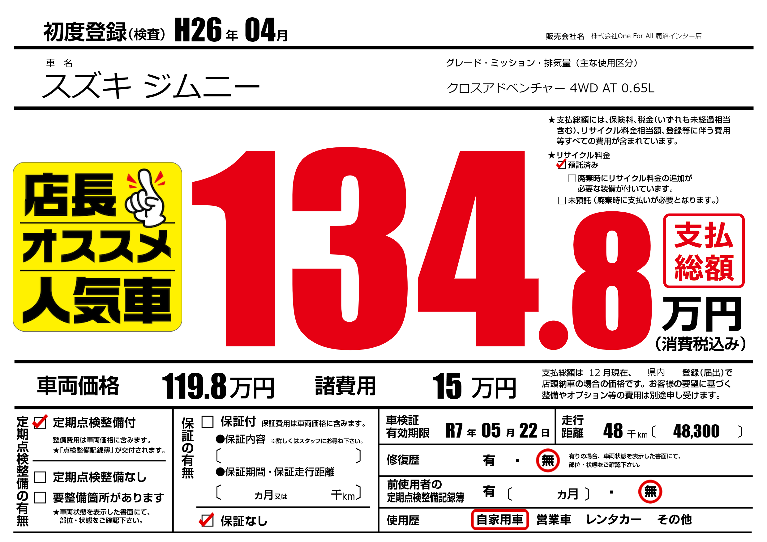 なし | 車検制限 | R7年05月22月 |