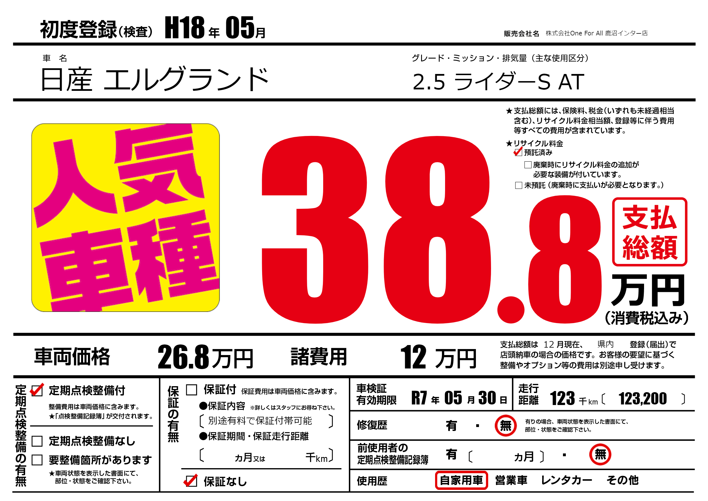 | 走行キロ | 12.3万km | 初年度登録 | H18年05月 |
