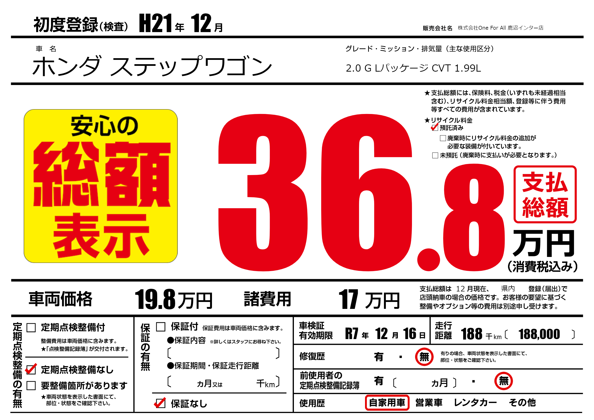 | 走行キロ | 18.8万km | 初年度登録 | H21年12月 |