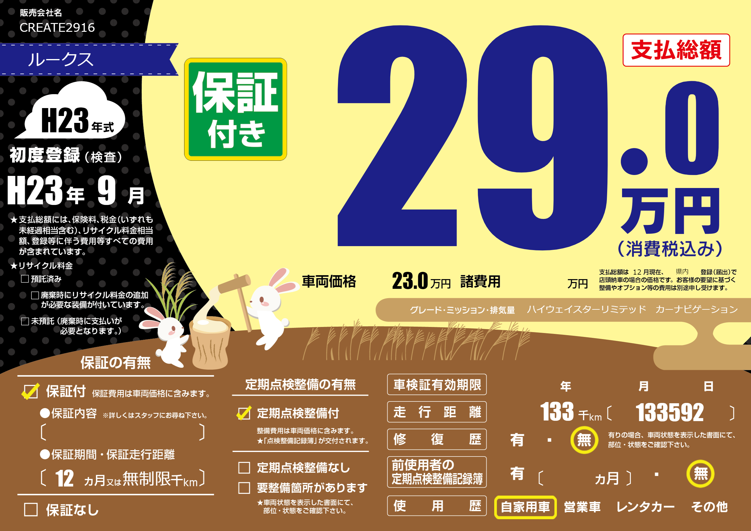 | 走行キロ | 13.3万km | 初年度登録 | H23年9月 |