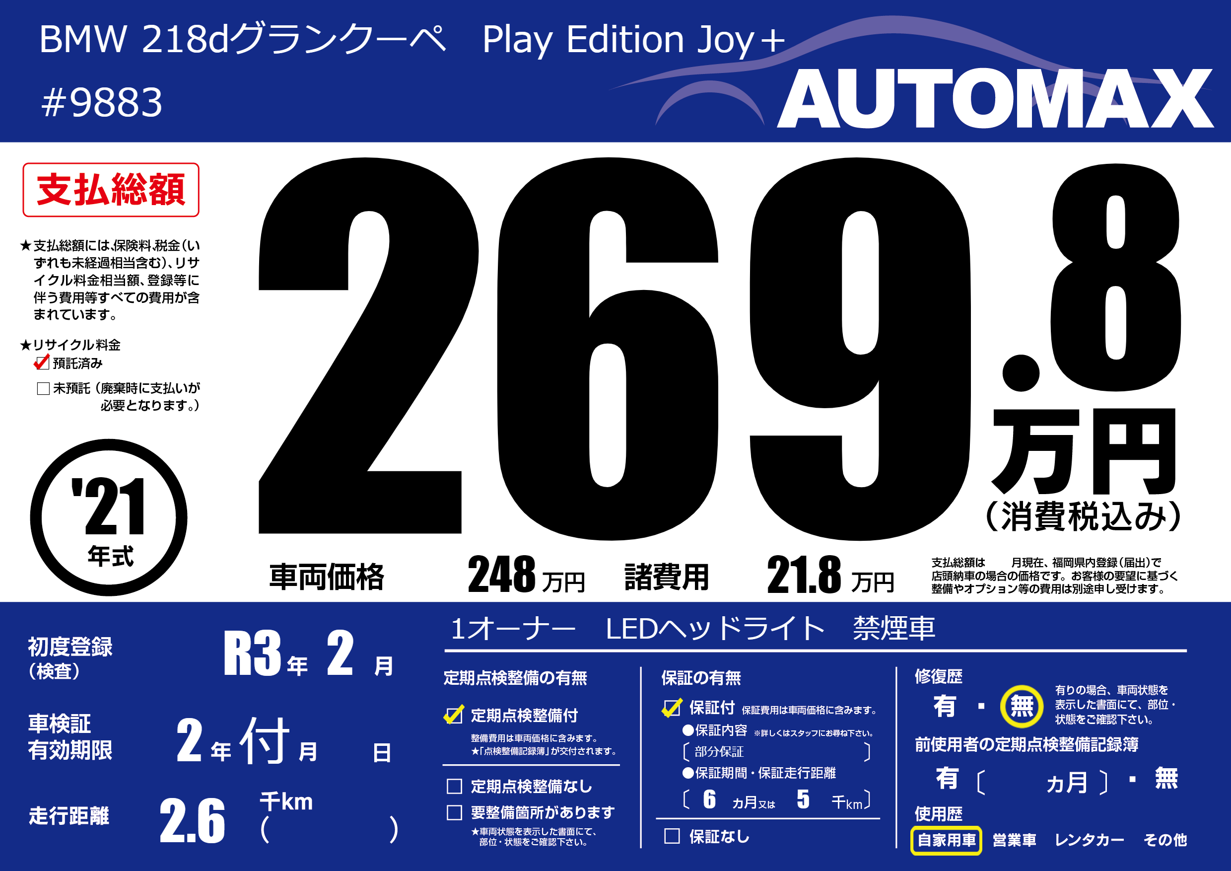 | 車名 | BMW 218dグランクーペ Play Edition Joy+ | グレード ミッション 排気量 |