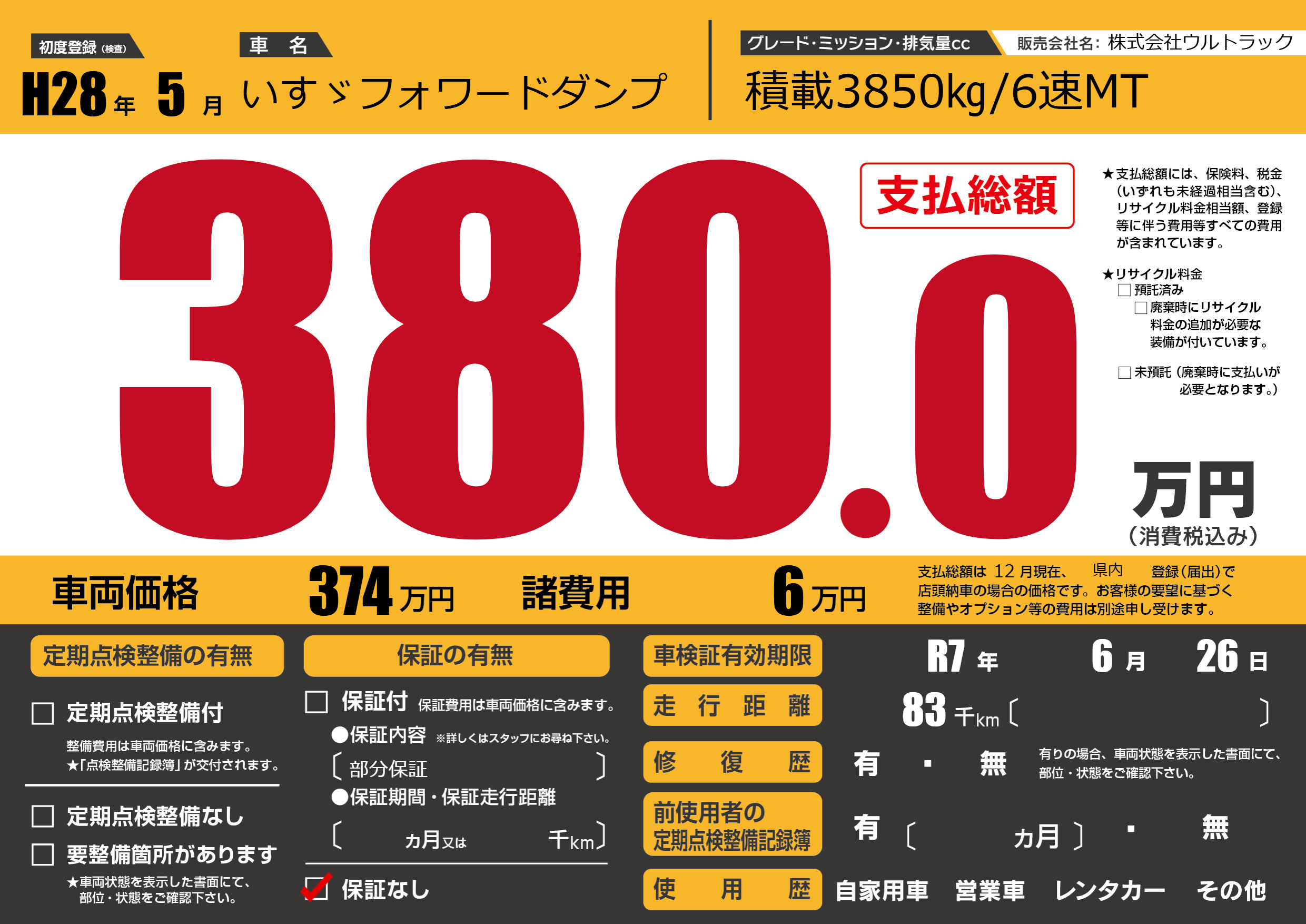 | 車名 | いすゞフォワードダンプ | グレード ミッション 排気量 |