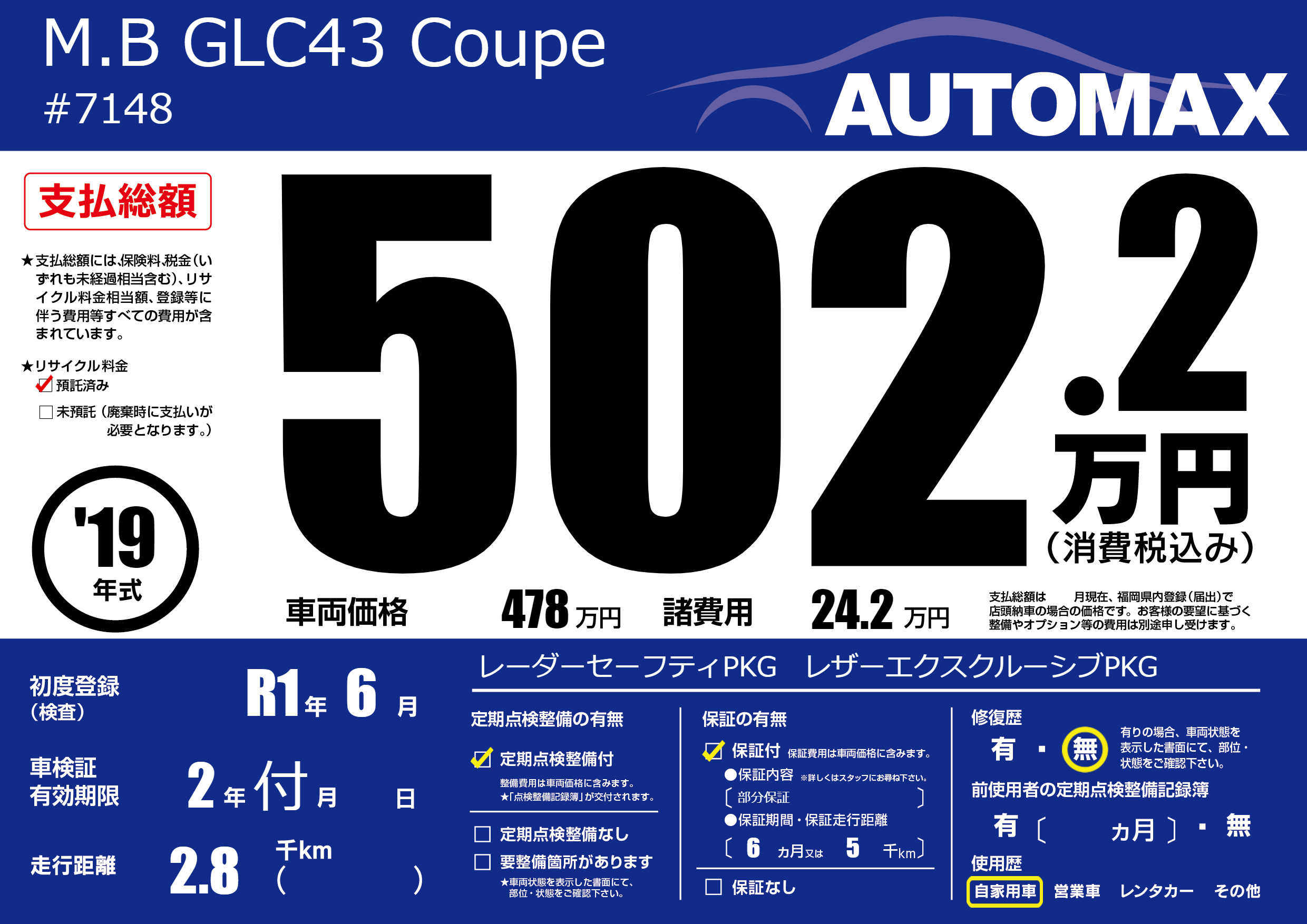 | 車名 | M.B GLC43 Coupe | グレード ミッション 排気量 |
