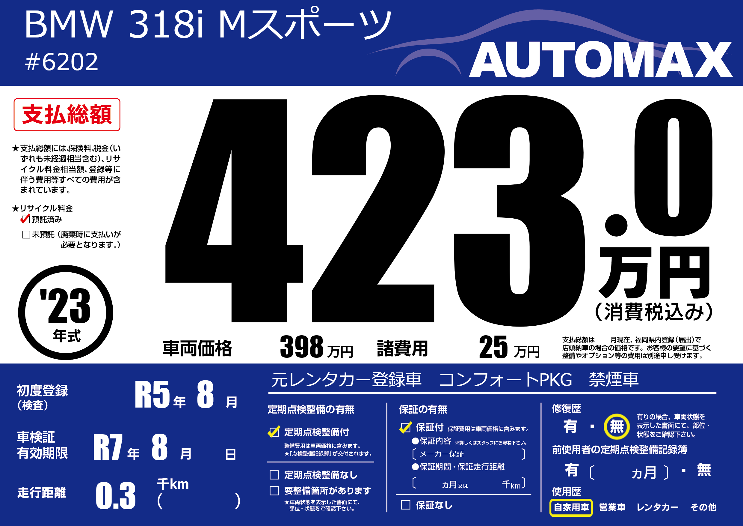 | 車名 | BMW 318i Mスポーツ | グレード ミッション 排気量 |