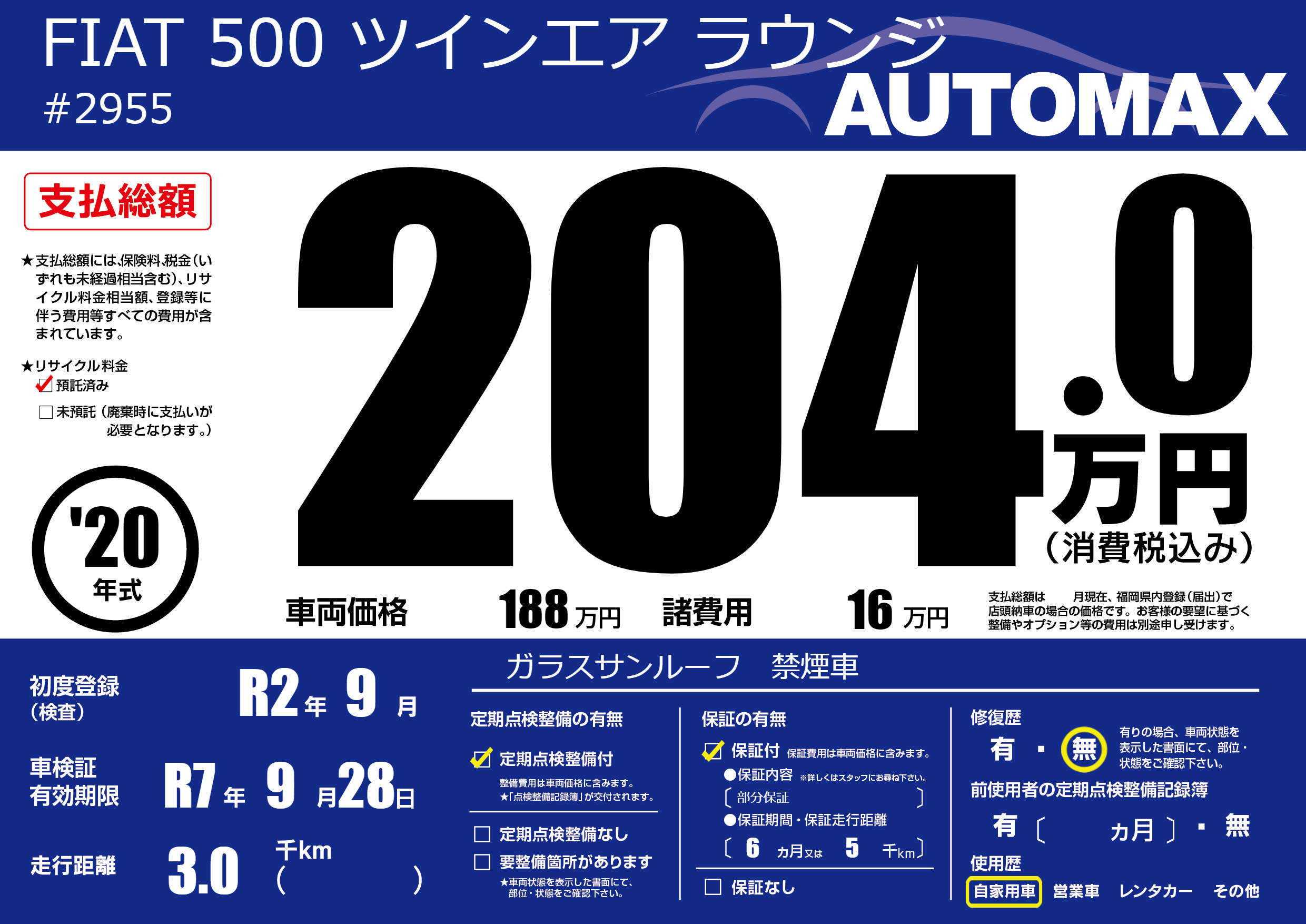 | 車名 | FIAT 500 ツインエア ラウンジ | グレード ミッション 排気量 |