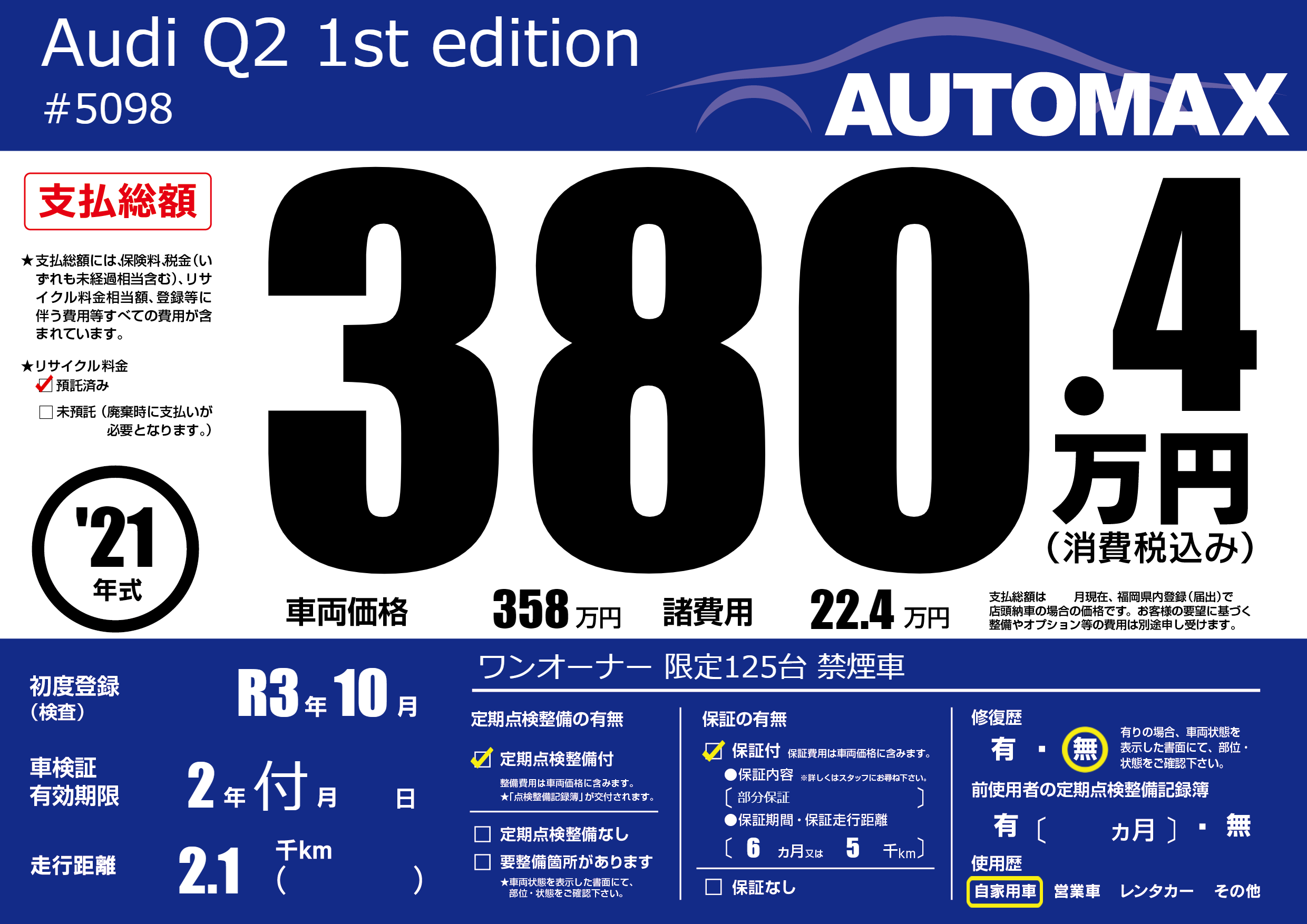 保証付き 保証内容(部分保証) 6ヶ月または(5)千kmまで |