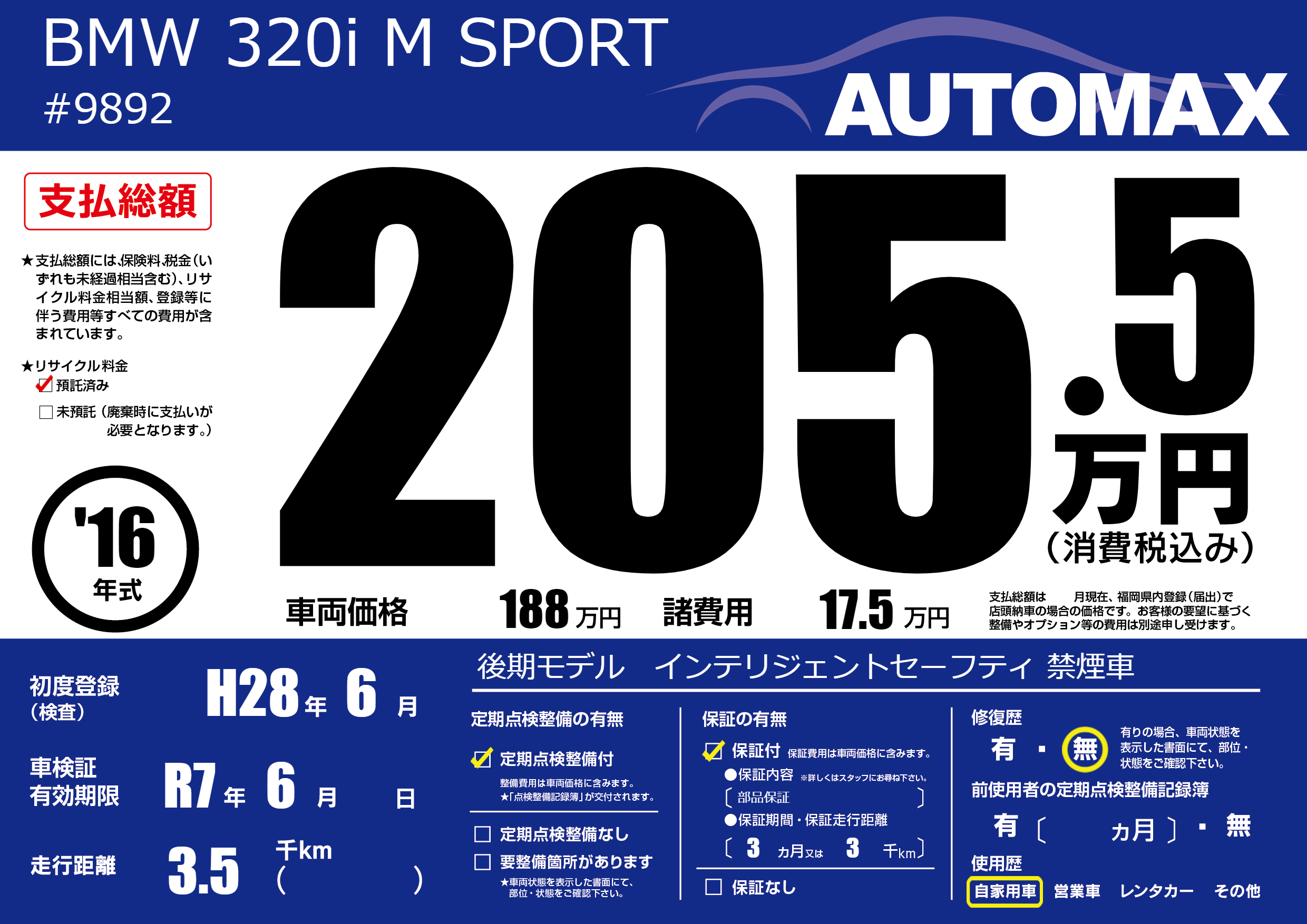 | 車名 | BMW 320i M SPORT | グレード ミッション 排気量 |
