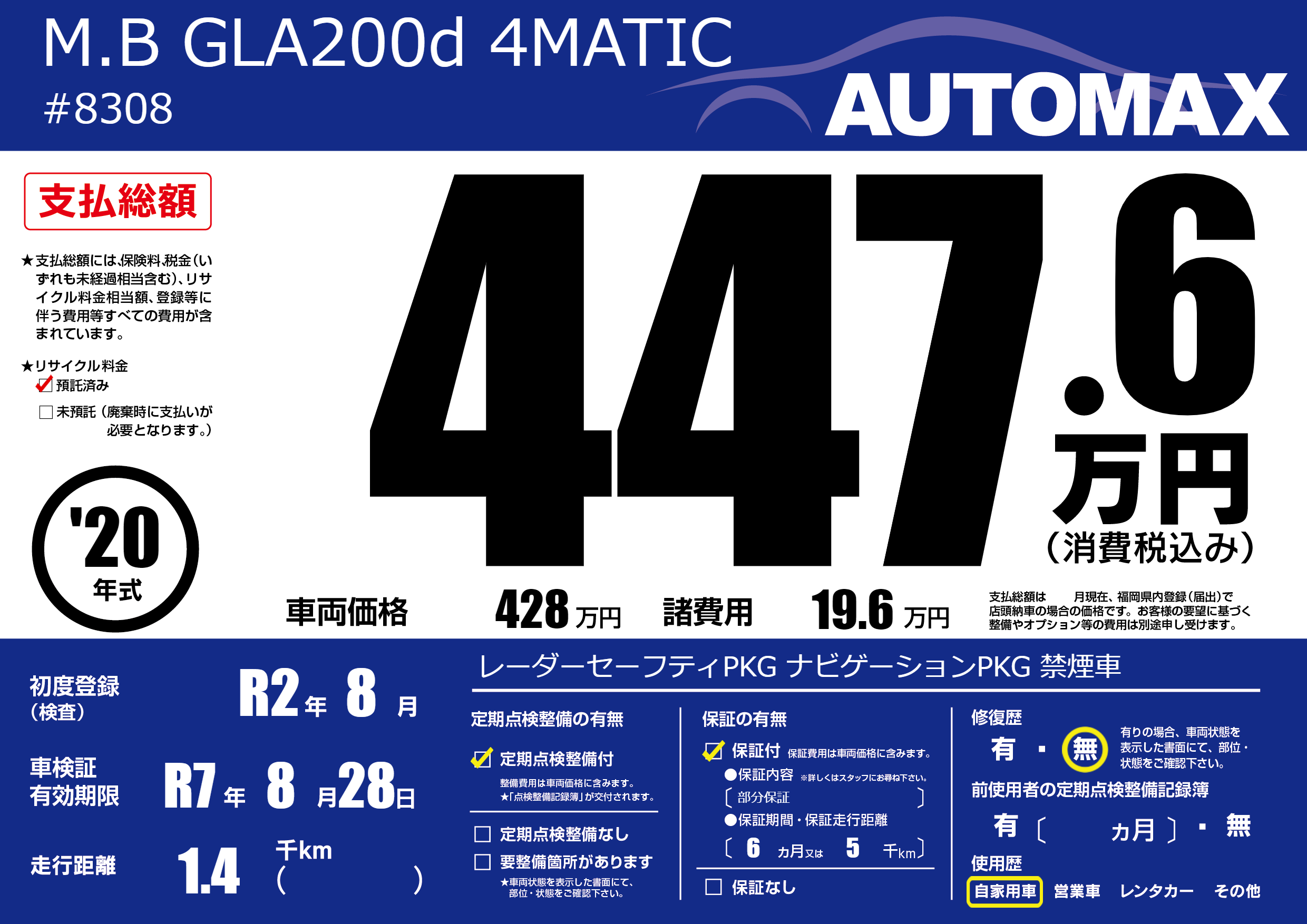 | 車名 | M.B GLA200d 4MATIC | グレード ミッション 排気量 |