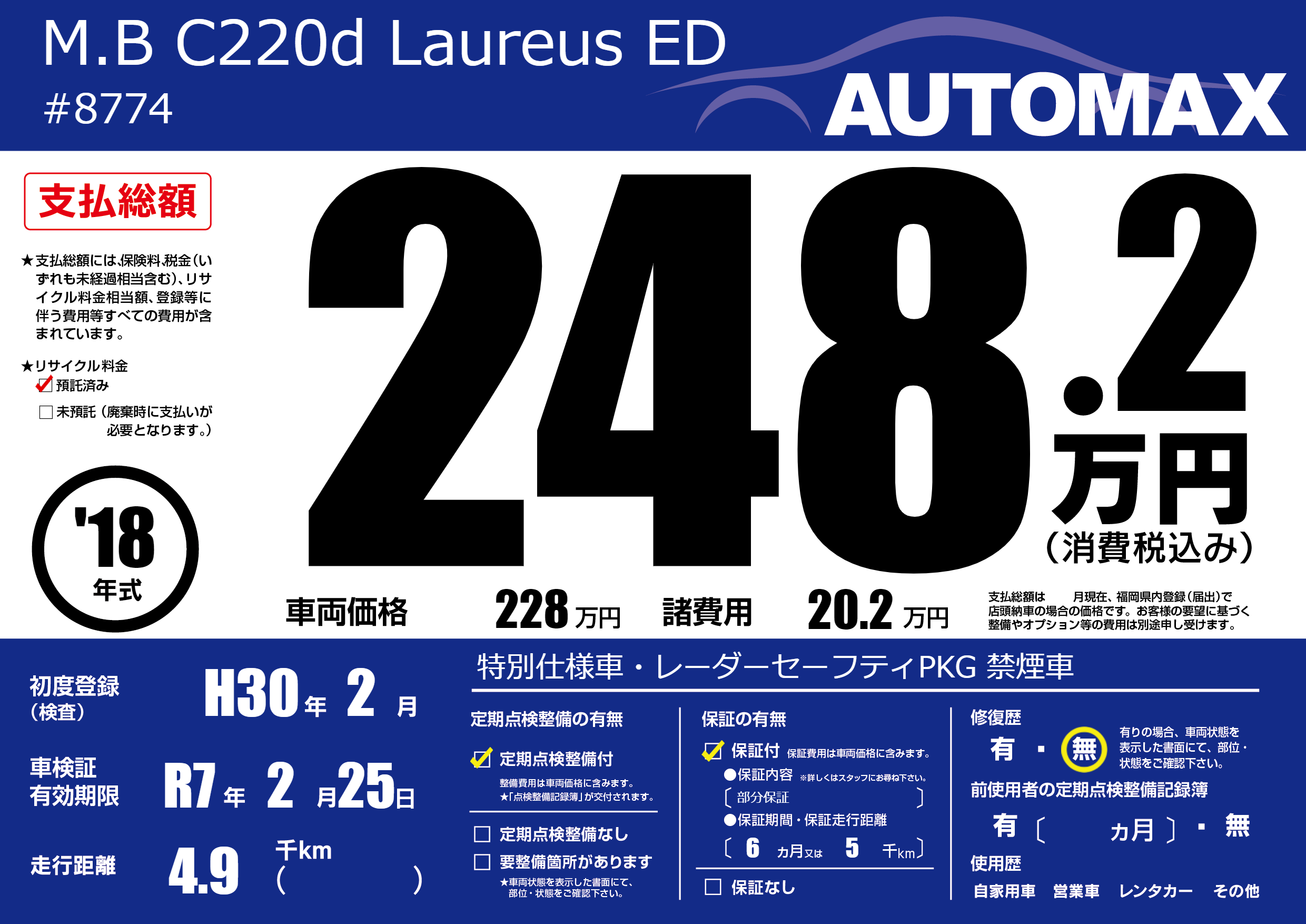 | 車名 | M.B C220d Laureus ED | グレード ミッション 排気量 |