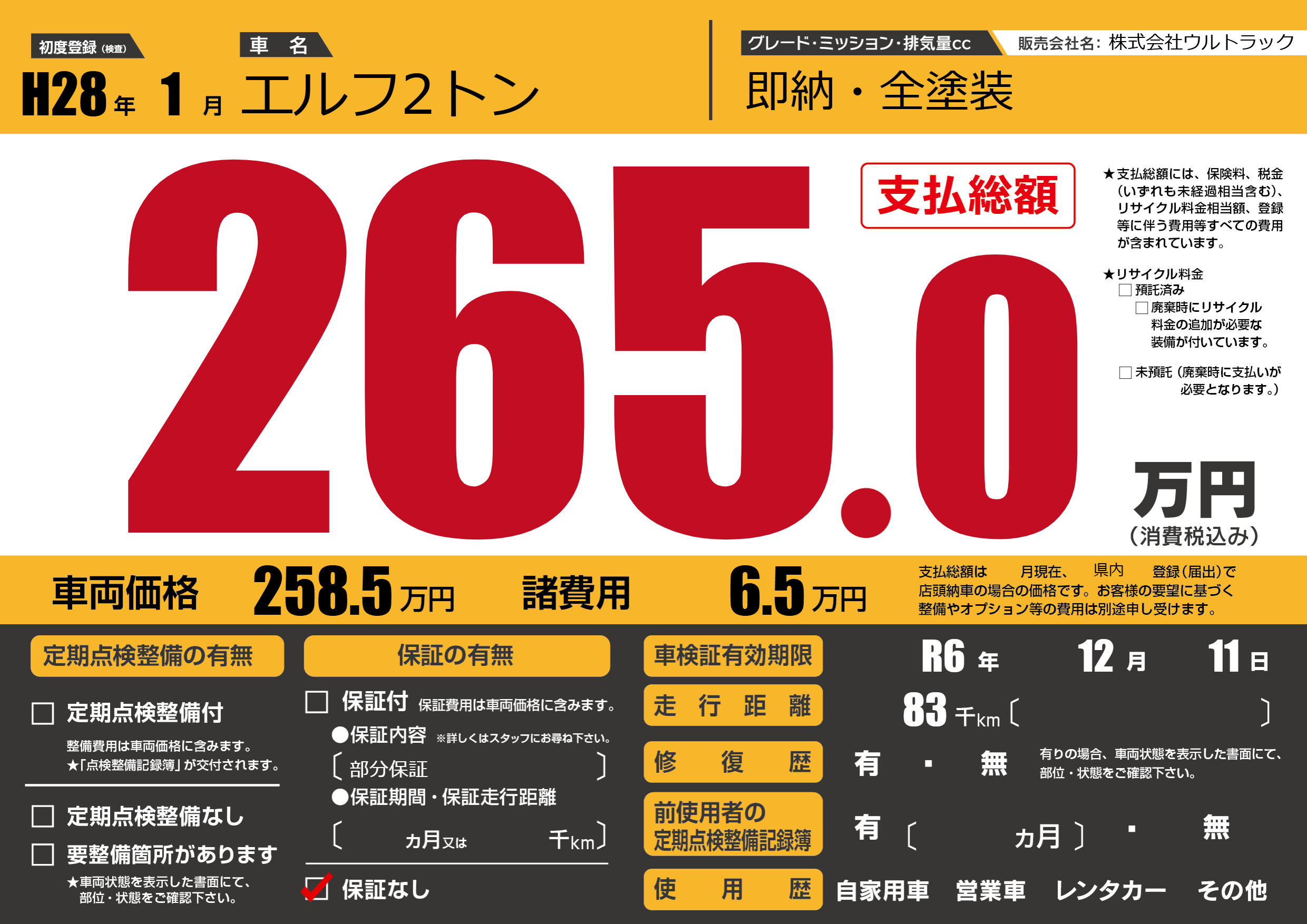 | 車名 | エルフ2トン | グレード ミッション 排気量 |