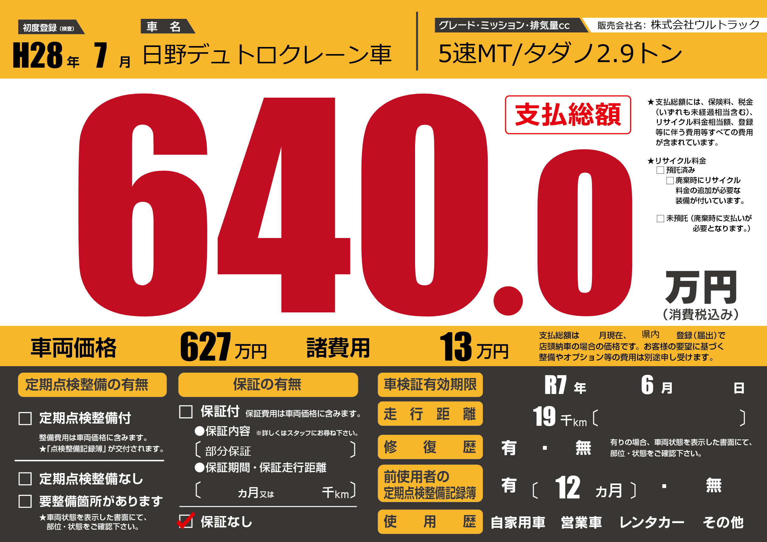 | 車名 | 日野デュトロクレーン車 | グレード ミッション 排気量 |