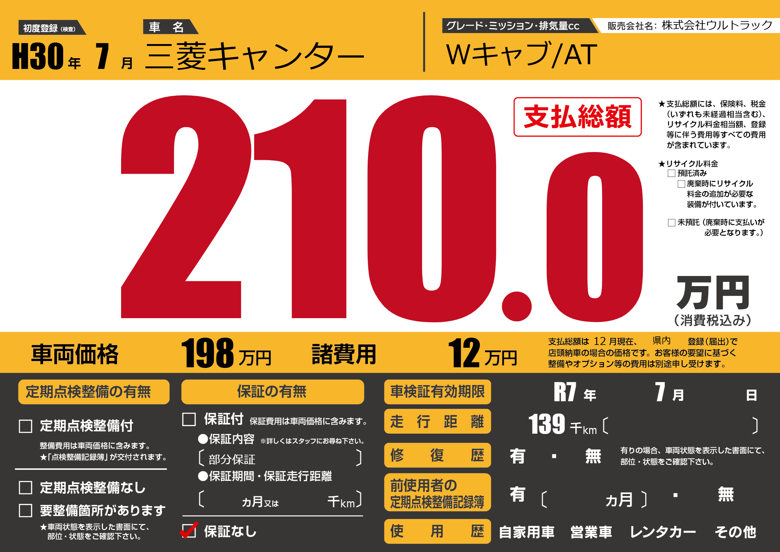 | 走行キロ | 13.9万km | 初年度登録 | H30年7月 |