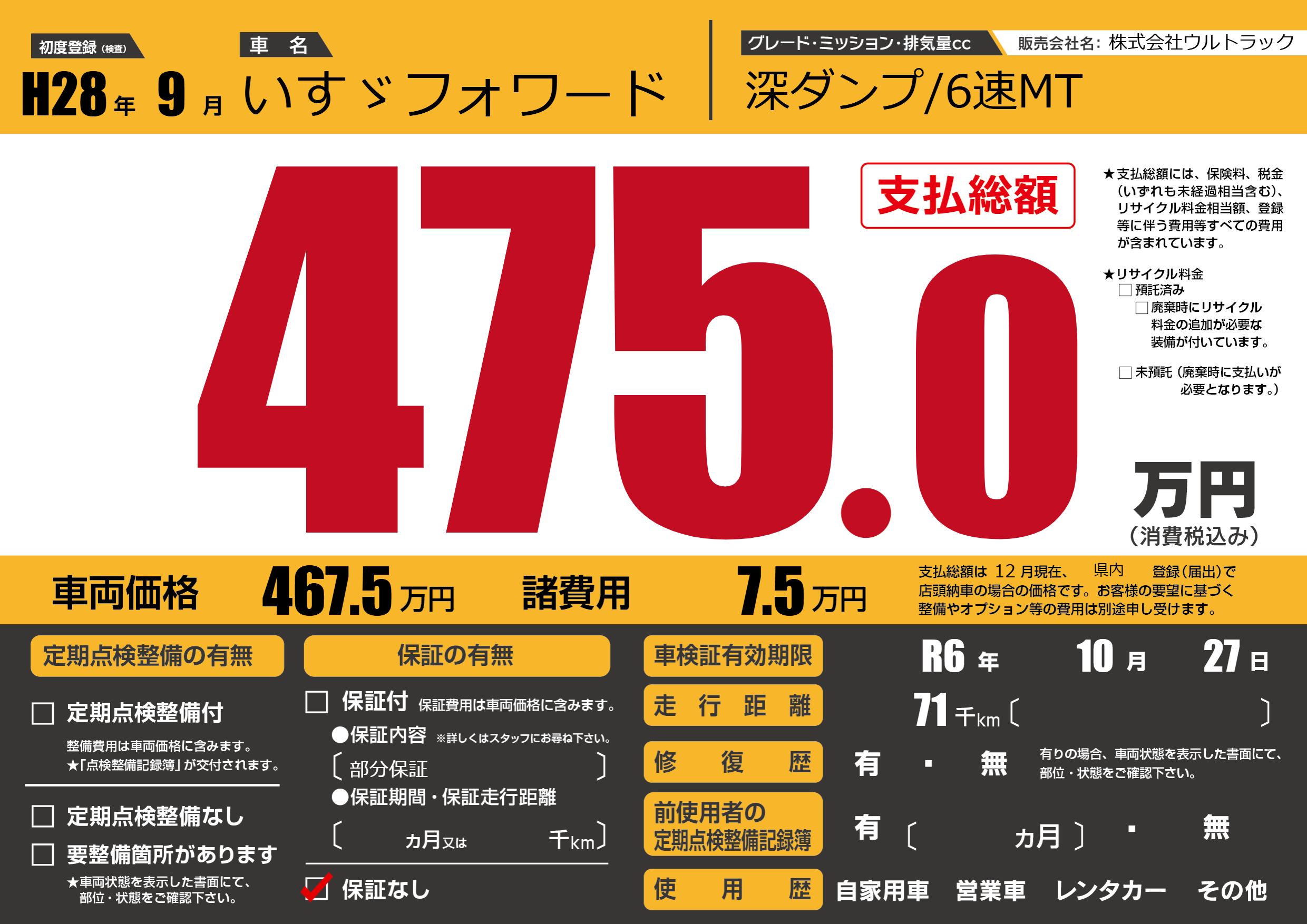 保証なし 保証内容(部分保証) ---ヶ月または()千kmまで |